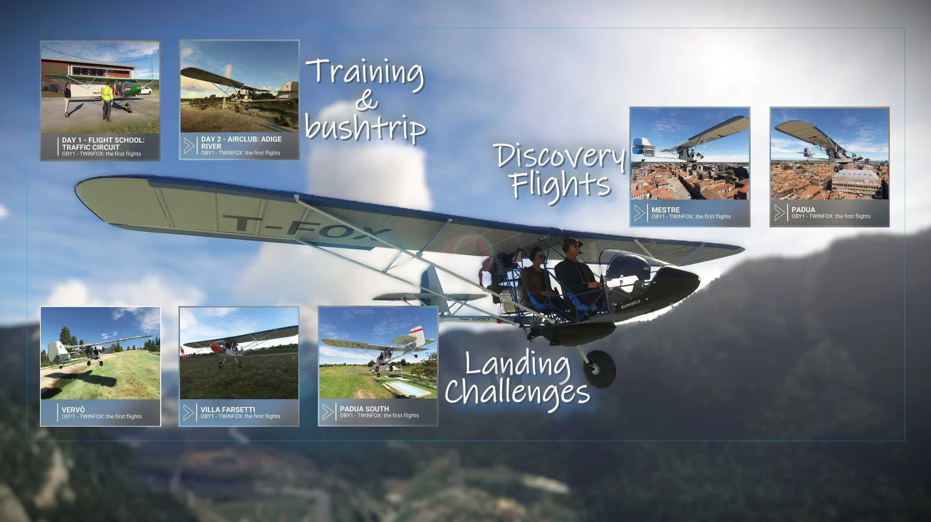 INSTRUCTIONS !! For this add-on you must have the ultralight aircraft OBY1 “Eurofly Twinfox” installed in the simulator's community folder !! This activity pack is not currently fully compatible with FS2024. ! Use the latest official version of Microsoft Flight Simulator 2020 with ALL FREE MS/ASOBO CONTENT INSTALLED (Word & City updates, activities, aircraft, etc.) ! In case of conflicts with other scenarios, temporarily remove those with the same ICAO codes listed above ! For a better gaming experience, we recommend using a joystick, keyboard and mouse ! You will find the contents of this package in ACTIVITIES/CUSTOM CONTENT
