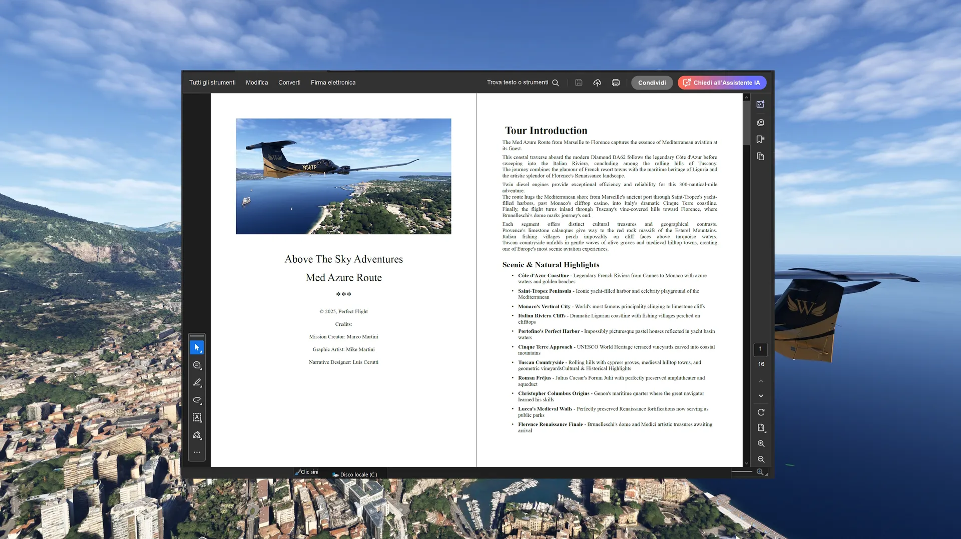 The Med Azure Route from Marseille to Florence captures the essence of Mediterranean aviation at its finest. This coastal traverse aboard the modern Diamond DA62 follows the legendary Côte d'Azur before sweeping into the Italian Riviera, concluding among the rolling hills of Tuscany.