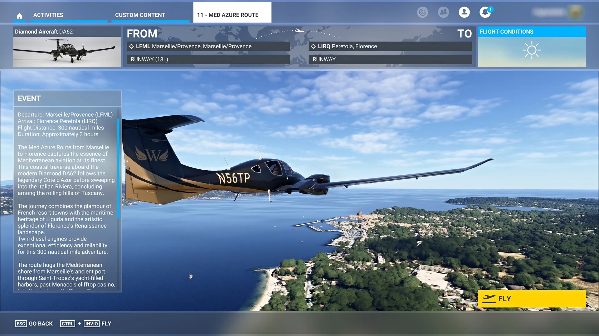 ■ 2. Above The Sky - Med Azure Route The route hugs the Mediterranean shore from Marseille's ancient port through Saint-Tropez's yacht-filled harbors, past Monaco's clifftop casino, into Italy's dramatic Cinque Terre coastline. Finally, the flight turns inland through Tuscany's vine-covered hills toward Florence, where Brunelleschi's dome marks journey's end.