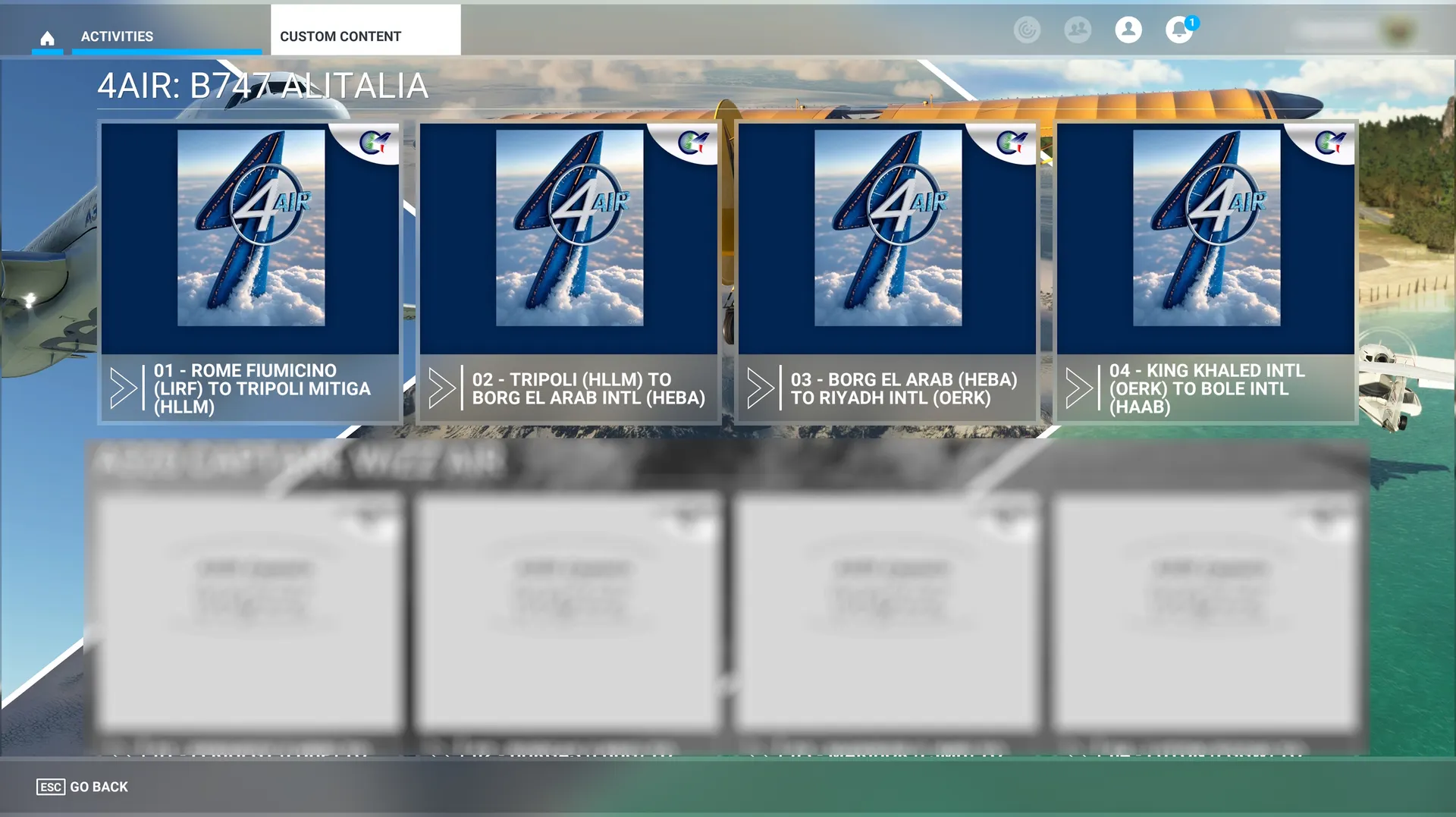 Soar through aviation history in this 4AIR package, featuring historically authentic B747 missions that celebrate Alitalia's sophisticated intercontinental legacy and the unmistakable Italian flair that defined luxury aviation's golden age.