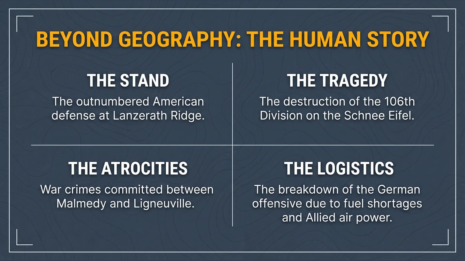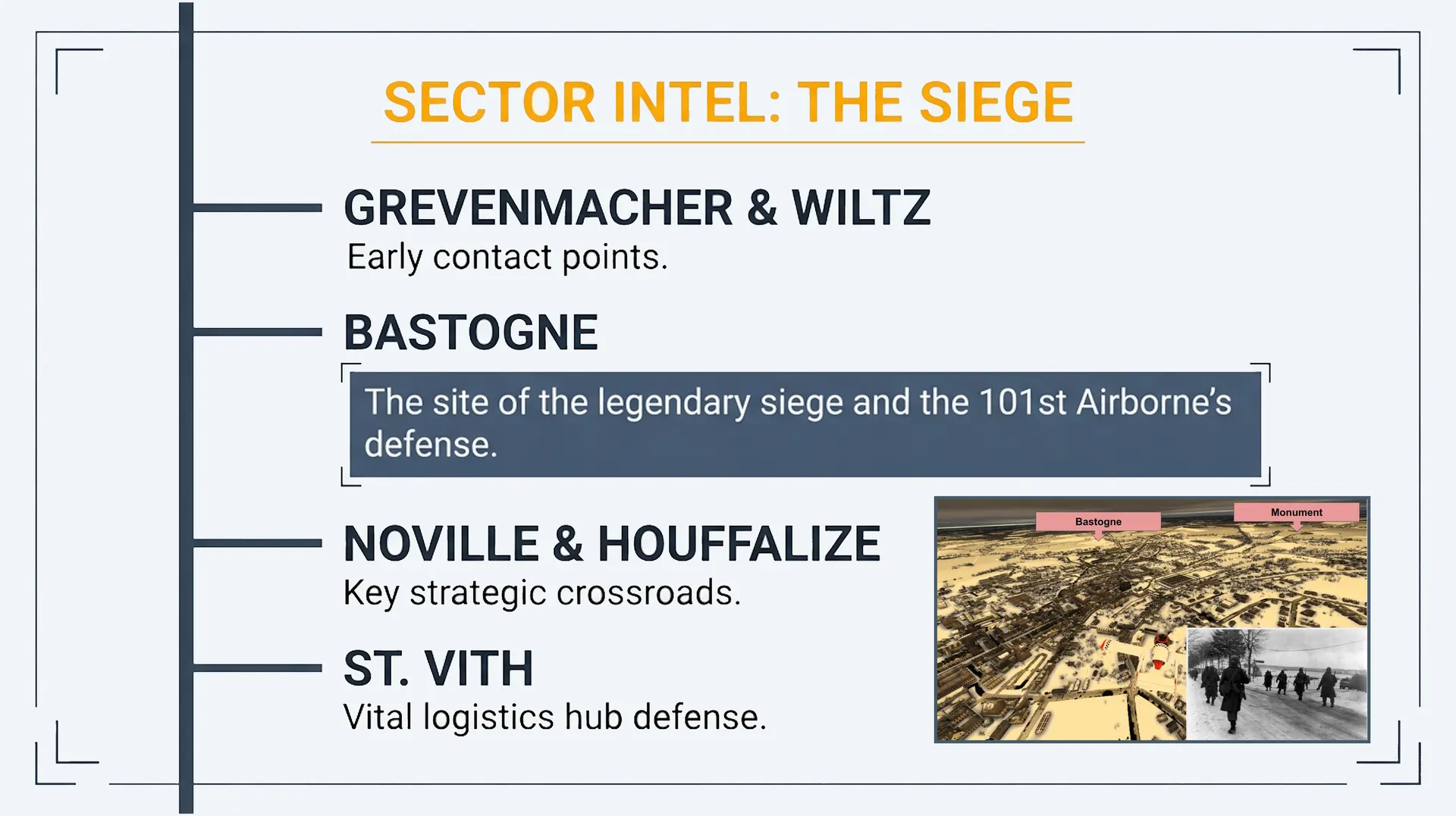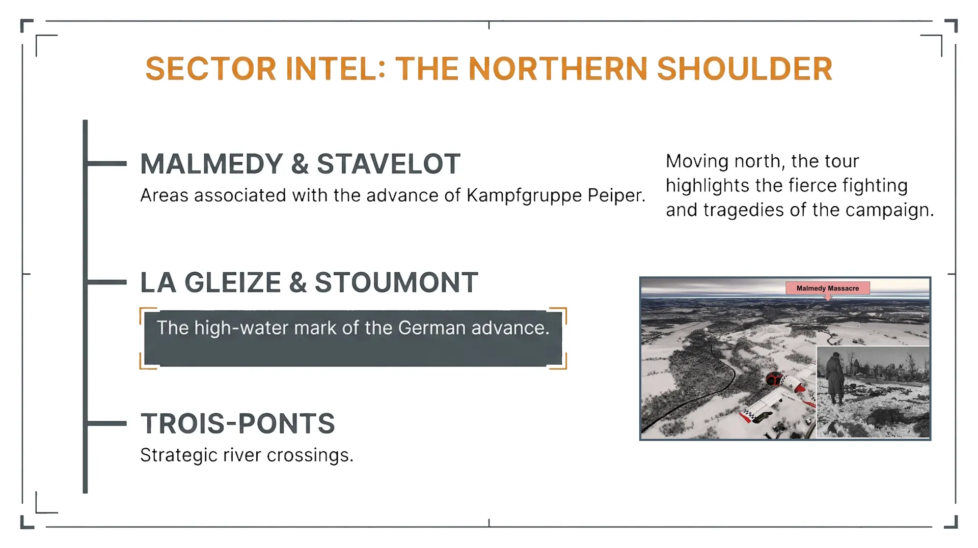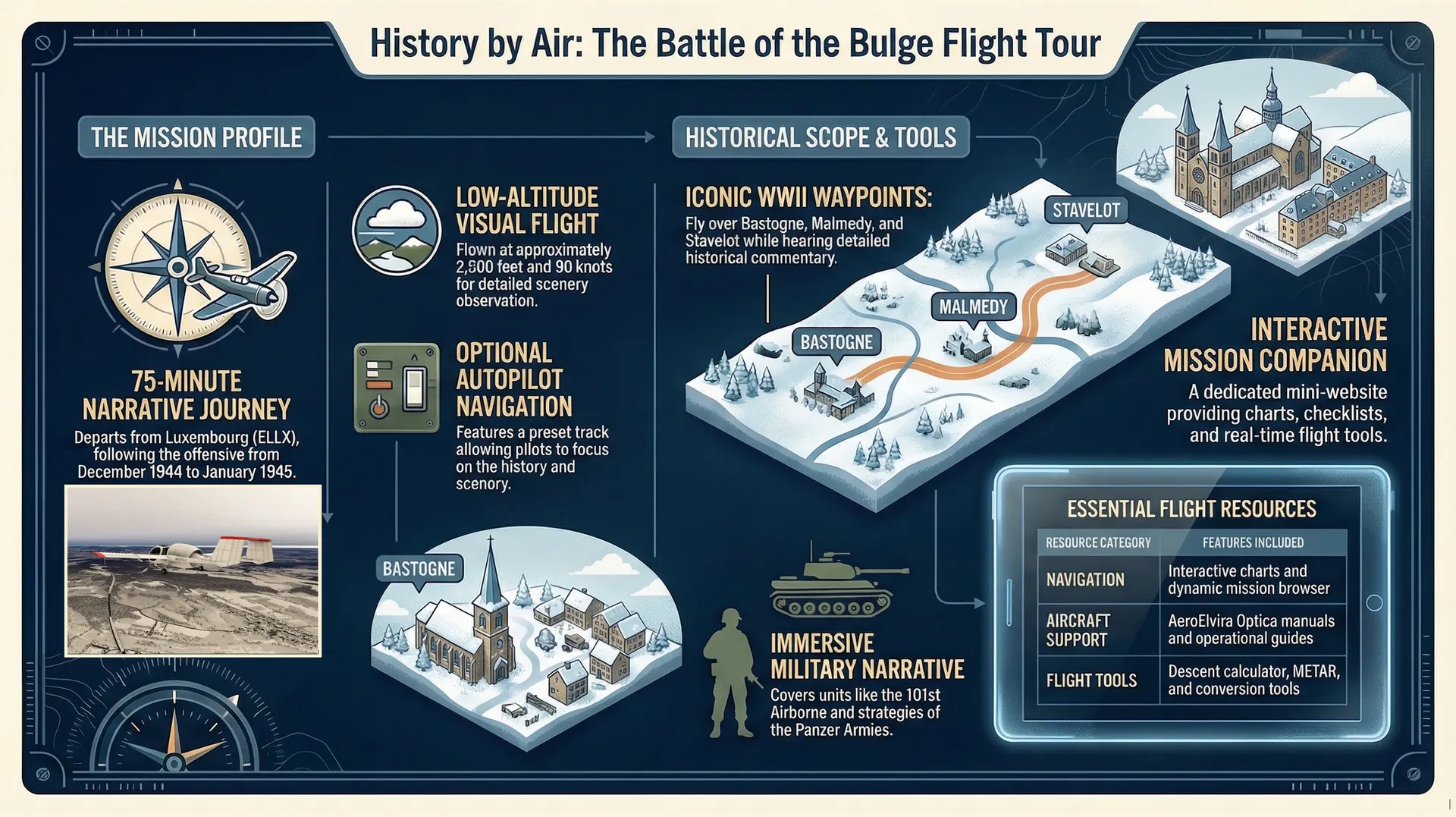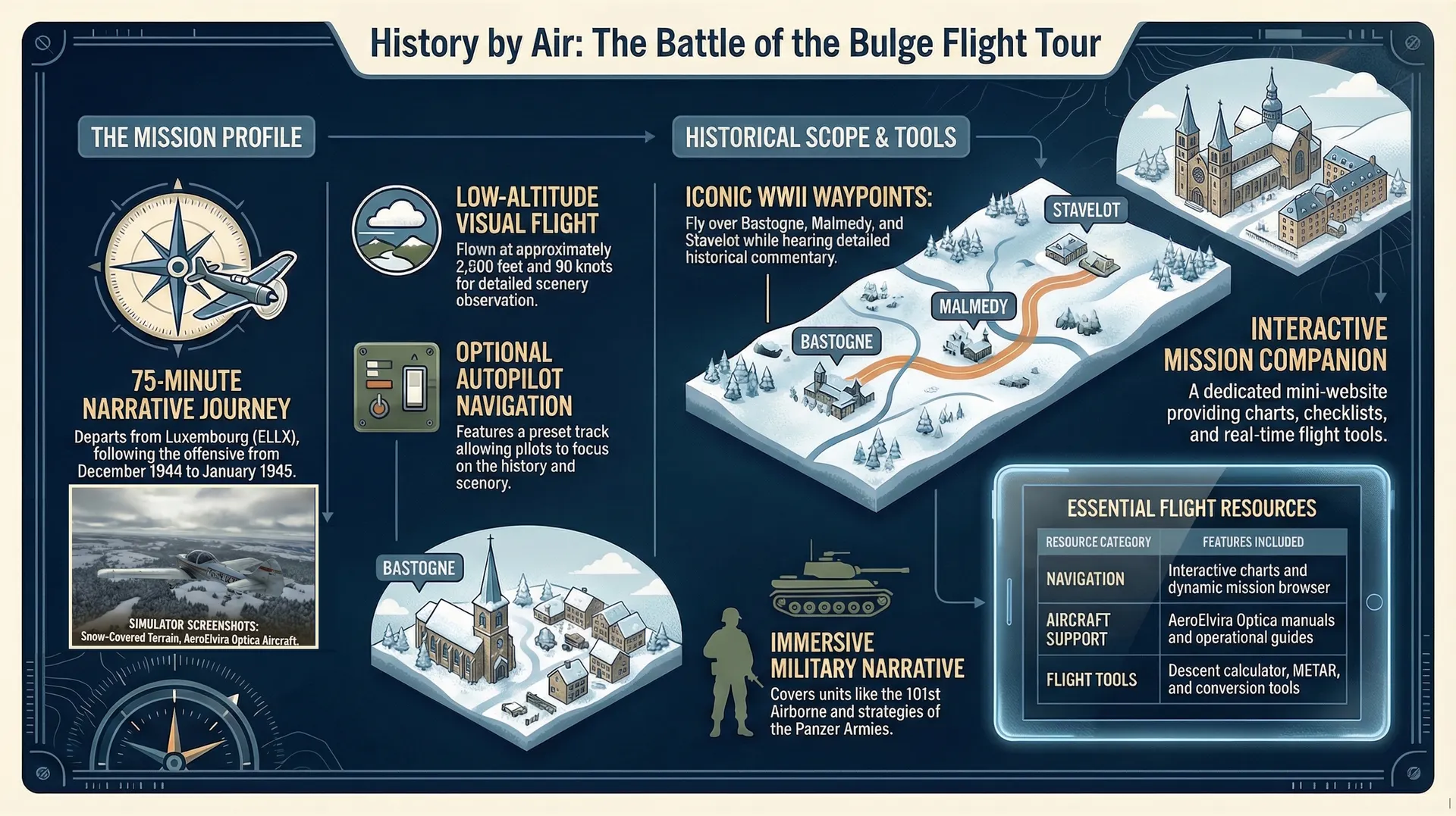 Designed as a true guided historical tour, this package offers a 75‑minute mission to be flown at low altitude (around 2,500 feet and 90 knots) along a preset route, with an optional autopilot-assisted navigation track so you can focus on the scenery and the story. You depart from Luxembourg Airport (ELLX) and follow the German offensive and Allied counterattack from the first breakthroughs in December 1944 to the collapse of the “bulge” in January 1945. ■ Historical Mission Overview Along the way you pass key waypoints such as Grevenmacher, Wiltz, Bastogne, Noville, Houffalize, St. Vith, Malmedy, Stavelot, Trois-Ponts, Stoumont and La Gleize, each accompanied by detailed narration explaining what happened on the ground beneath your wings during those bitter winter days. The historical commentary covers German Seventh, Fifth Panzer and Sixth Panzer Armies, U.S. units like the 4th and 28th Infantry Divisions, 101st Airborne, 106th Infantry Division, 7th Armored Division and more, highlighting decisive actions such as the siege of Bastogne, the stand on Elsenborn Ridge, and Patton’s rapid drive north. The tour also brings to life dramatic episodes of heroism and tragedy: the outnumbered American stand at Lanzerath Ridge, the destruction of the 106th Division on the Schnee Eifel, the atrocities committed by Kampfgruppe Peiper between Malmedy and Ligneuville, and the gradual breakdown of the German offensive due to fuel shortages, logistical chaos and overwhelming Allied air power. The flight ends near La Sauvenière, as the narration summarizes the human and material cost of the campaign and its decisive role in sealing the fate of the Third Reich in the West. Immersive Historical Narration Created for flight sim enthusiasts and history buffs alike, History by Air – Battle of the Bulge turns Microsoft Flight Simulator into an interactive classroom in the sky, letting you pause, circle points of interest and truly understand how terrain, weather and logistics shaped one of the largest and hardest-fought battles in U.S. Army history.