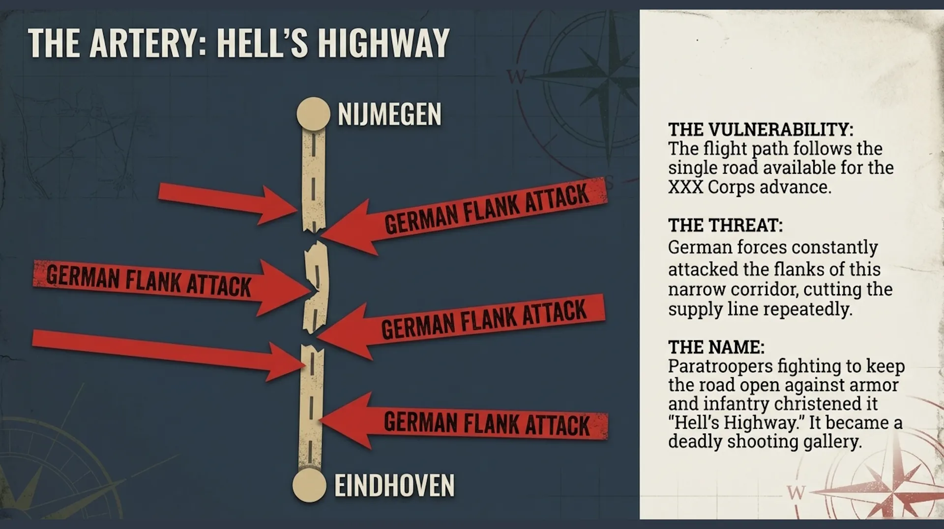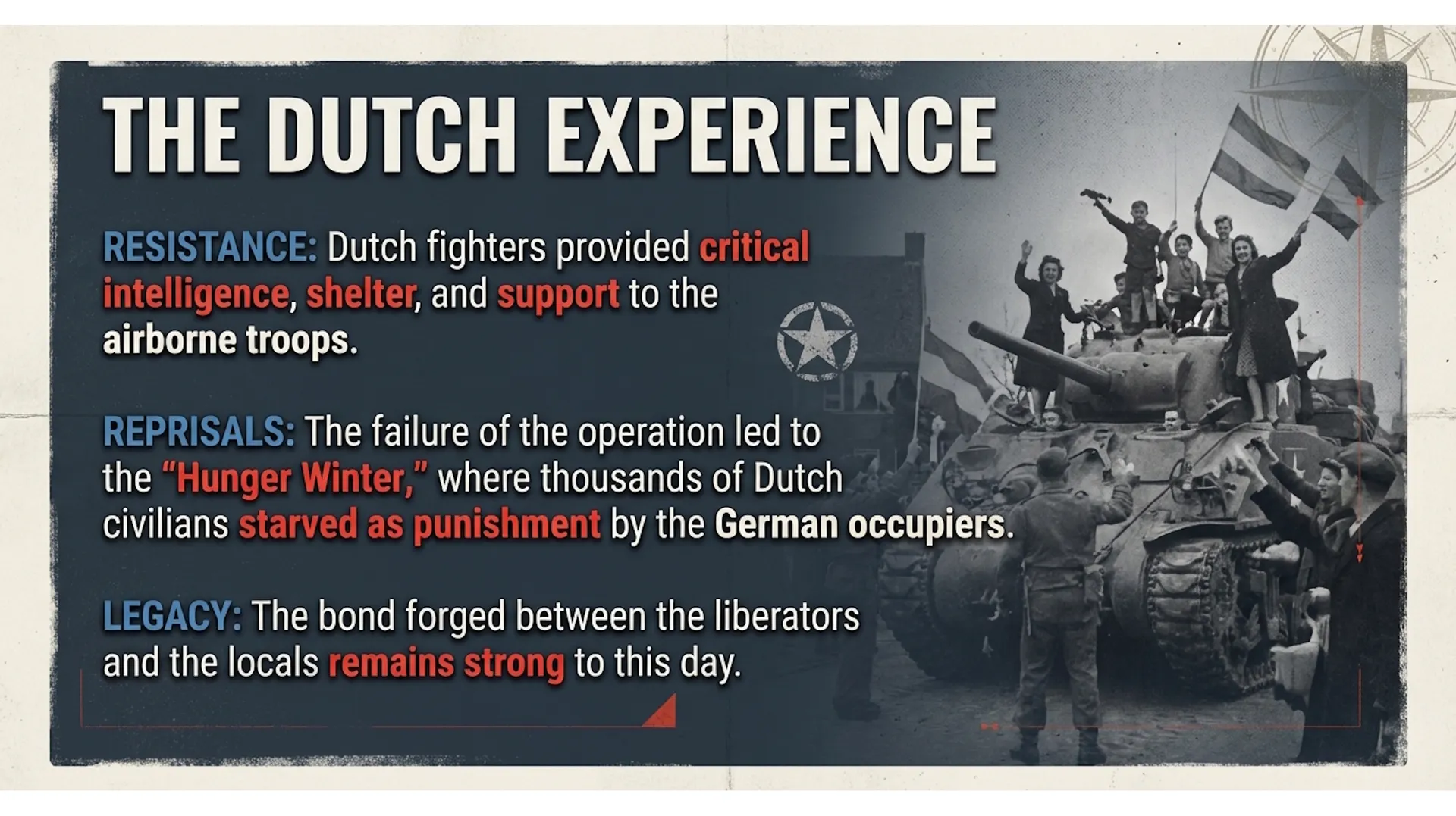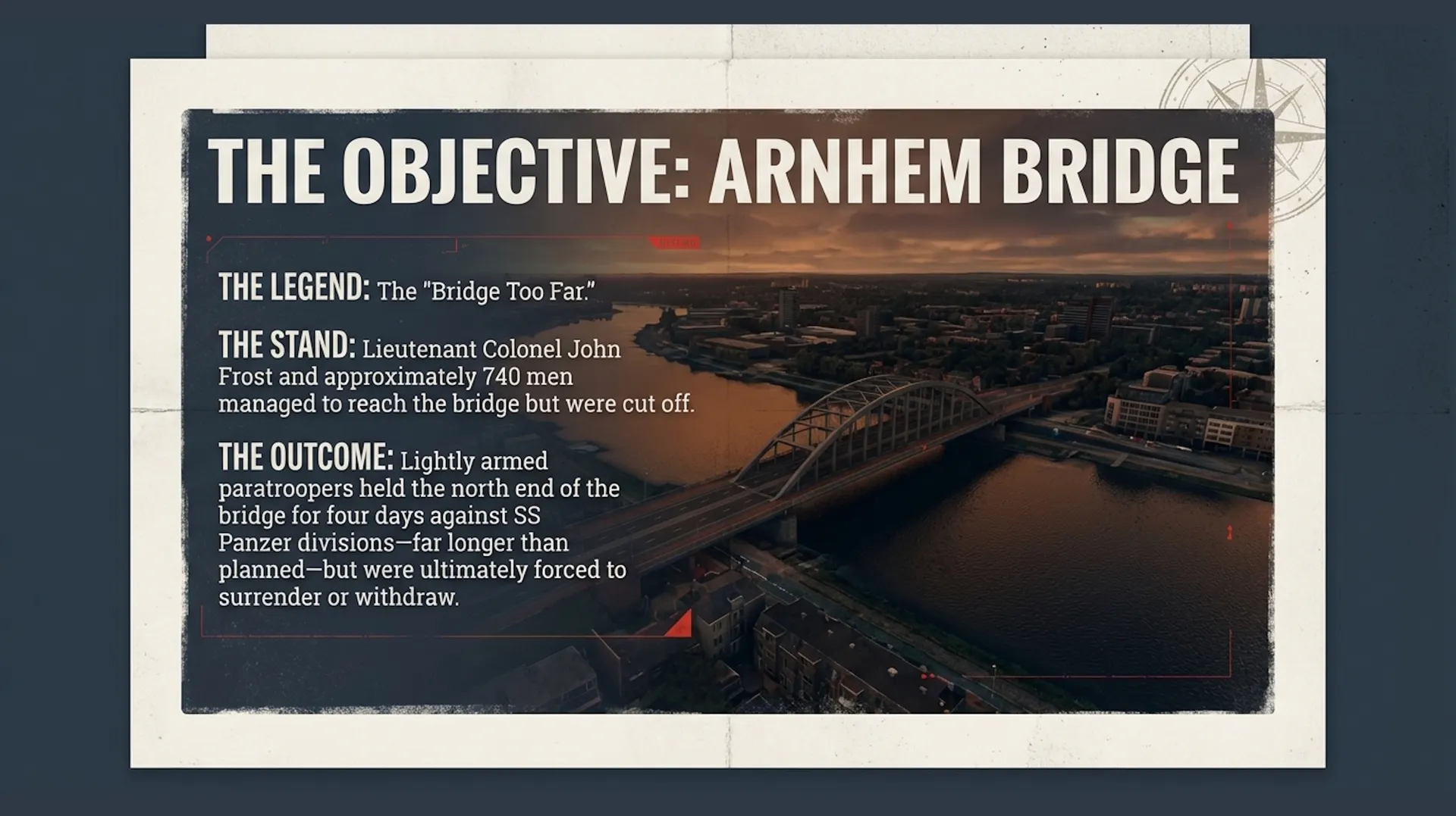- Joe's Bridge - Where Lieutenant Colonel Vandeleur's Irish Guards launched the ground assault on September 17, 1944 - Eindhoven - Liberation site of the American 101st Airborne "Screaming Eagles" - Hell's Highway - The vital supply artery that became a deadly shooting gallery under German counterattacks - Grave Bridge - Europe's longest bridge, seized in minutes by just 15 men of the 82nd Airborne - Nijmegen - Scene of fierce street fighting and the heroic Waal River crossing assault - Oosterbeek - The "cauldron" where British 1st Airborne held against overwhelming odds - Arnhem Bridge - The ultimate objective where Lieutenant Colonel John Frost's 740 men made their legendary stand Immersive Historical Narration Each landmark is accompanied by detailed historical voice narration that brings the operation to life, describing the actions of the American 101st and 82nd Airborne Divisions, the British XXX Corps and 1st Airborne Division, and the Polish 1st Independent Parachute Brigade.