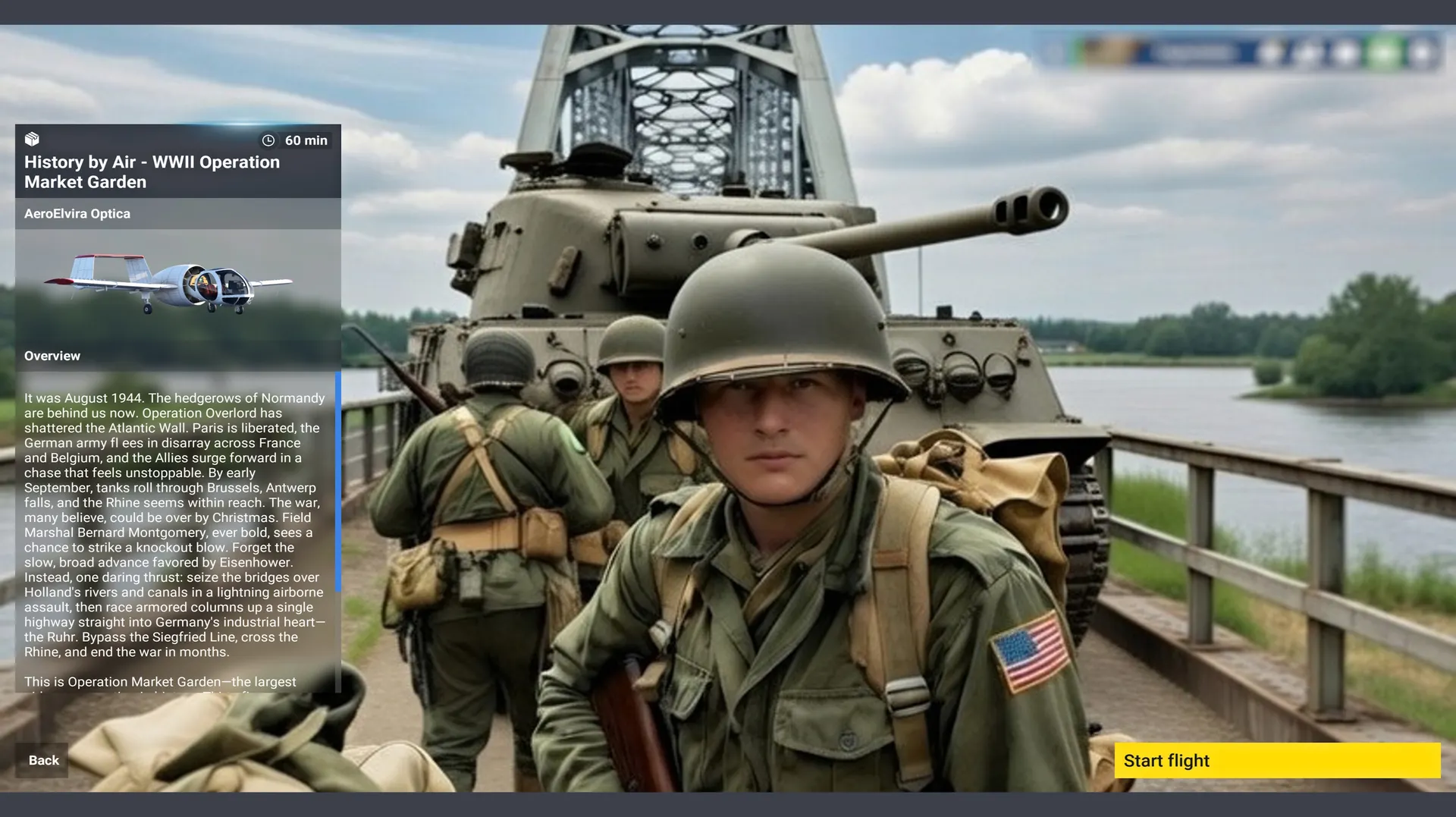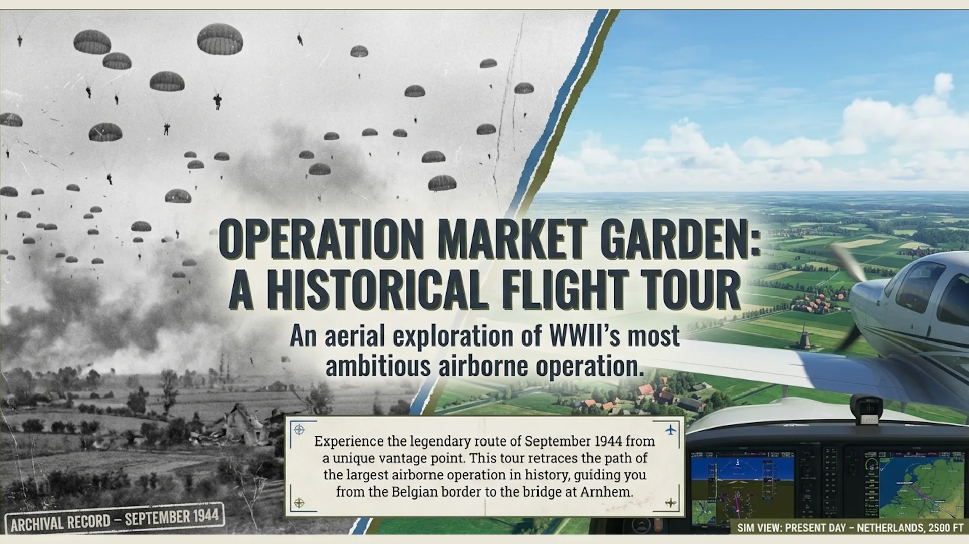 Experience one of World War II's most ambitious and dramatic military operations from a unique aerial perspective. This immersive Microsoft Flight Simulator excursion takes you over the legendary route of Operation Market Garden, the largest airborne operation in history that unfolded across the Netherlands in September 1944. ■ Historical Mission Overview In September 1944, with Paris liberated and Allied forces surging across Europe, British Field Marshal Bernard Montgomery conceived a daring plan to end the war by Christmas. Operation Market Garden would drop 35,000 paratroopers and glider troops to seize nine vital bridges across Holland's rivers and canals, creating a corridor for armored columns to race into Germany's industrial heartland—the Ruhr. The stakes were immense: success meant peace before winter; failure meant months of prolonged war. ■ Your Flight Experience This meticulously crafted tour guides you along the historical route from the Belgian border through Eindhoven, Nijmegen, and ultimately to Arnhem—site of the famous "bridge too far". Flying at or below 1,000 feet at 80-90 knots, you'll follow the same path taken by XXX Corps' ground forces along Hell's Highway, with key points of interest positioned on your left as you proceed northward. ■ Featured Waypoints Include