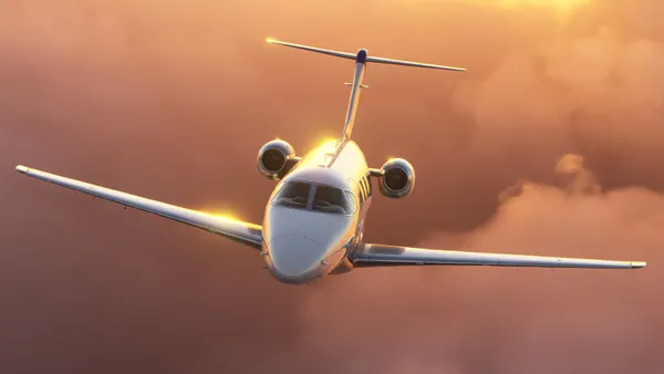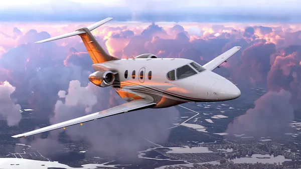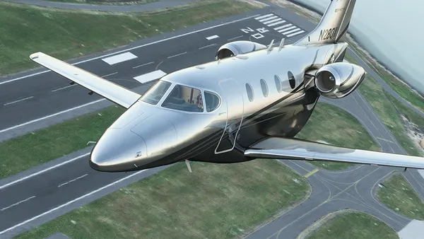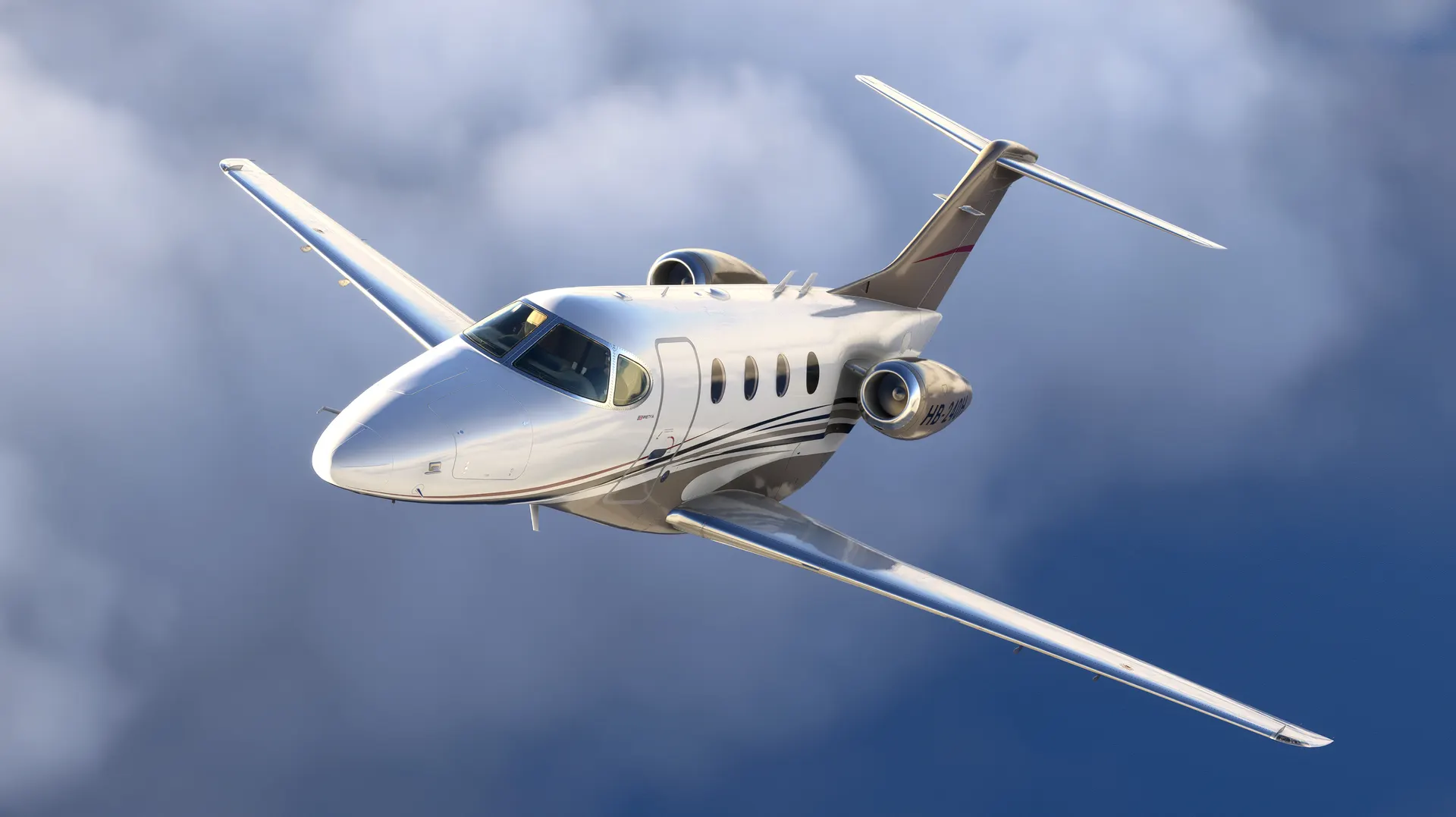 The B390 measures 46 feet, 0 inches in length, stands 14 feet, 6 inches tall, and has a wingspan of 44 feet, 6 inches. It is powered by two Williams FJ44-2A turbofan engines, each producing 2,300 pounds of thrust, driving the aircraft to impressive performance figures for its class.