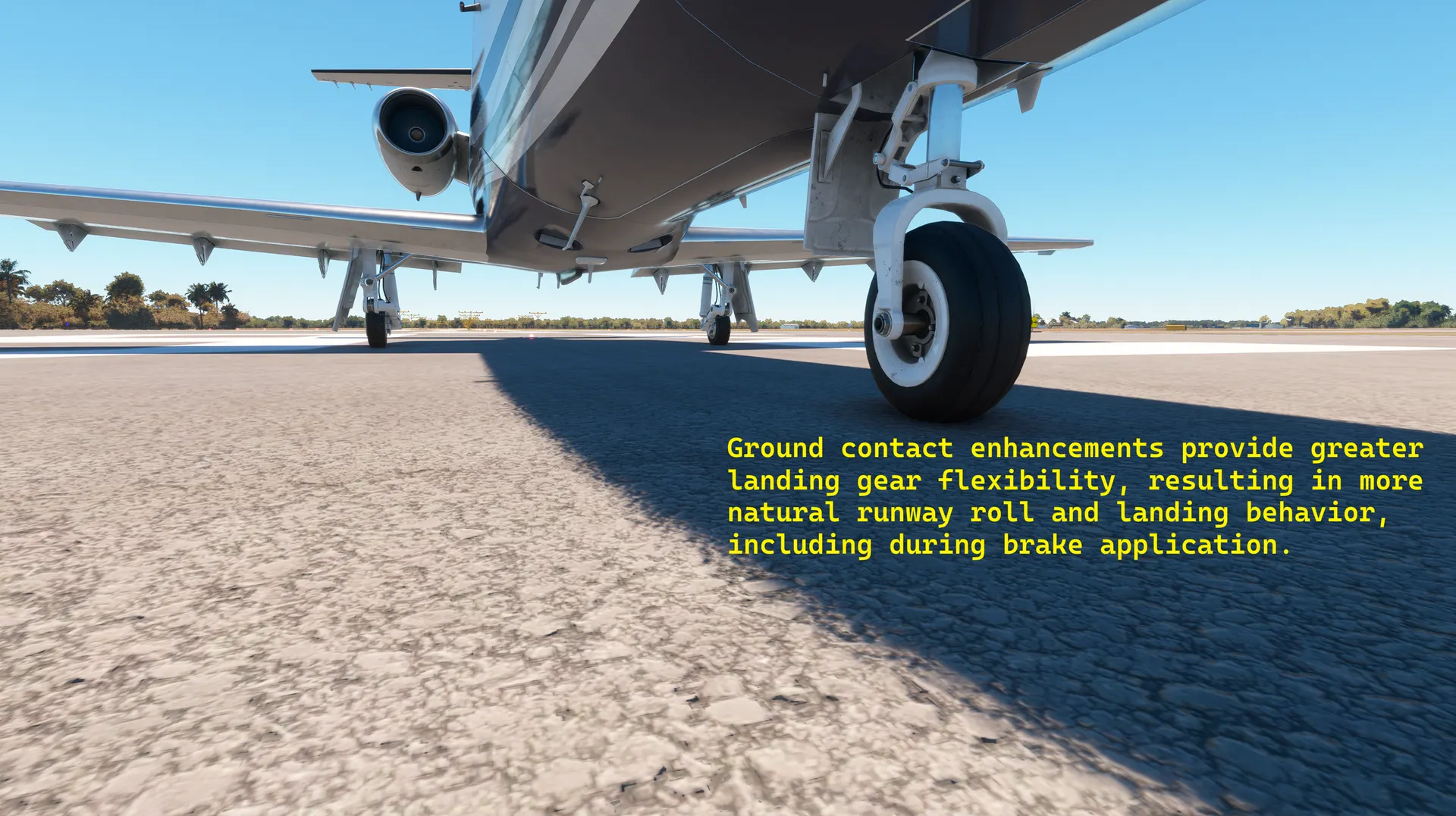 Modified suspension and tire parameters, improving ground contact and reducing excessive oscillation during taxiing and braking. Ground contact enhancements provide greater landing gear flexibility, resulting in more natural runway roll and landing behavior, including during brake application.