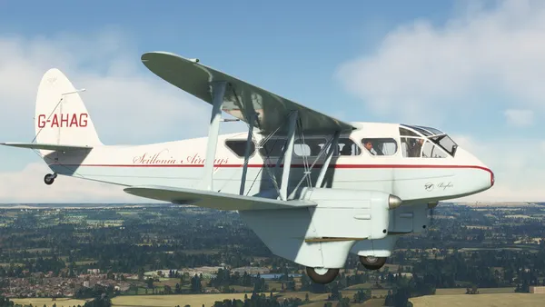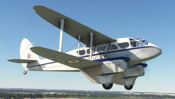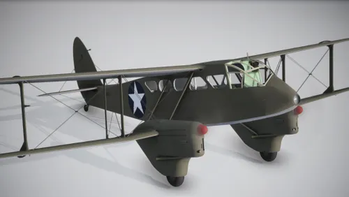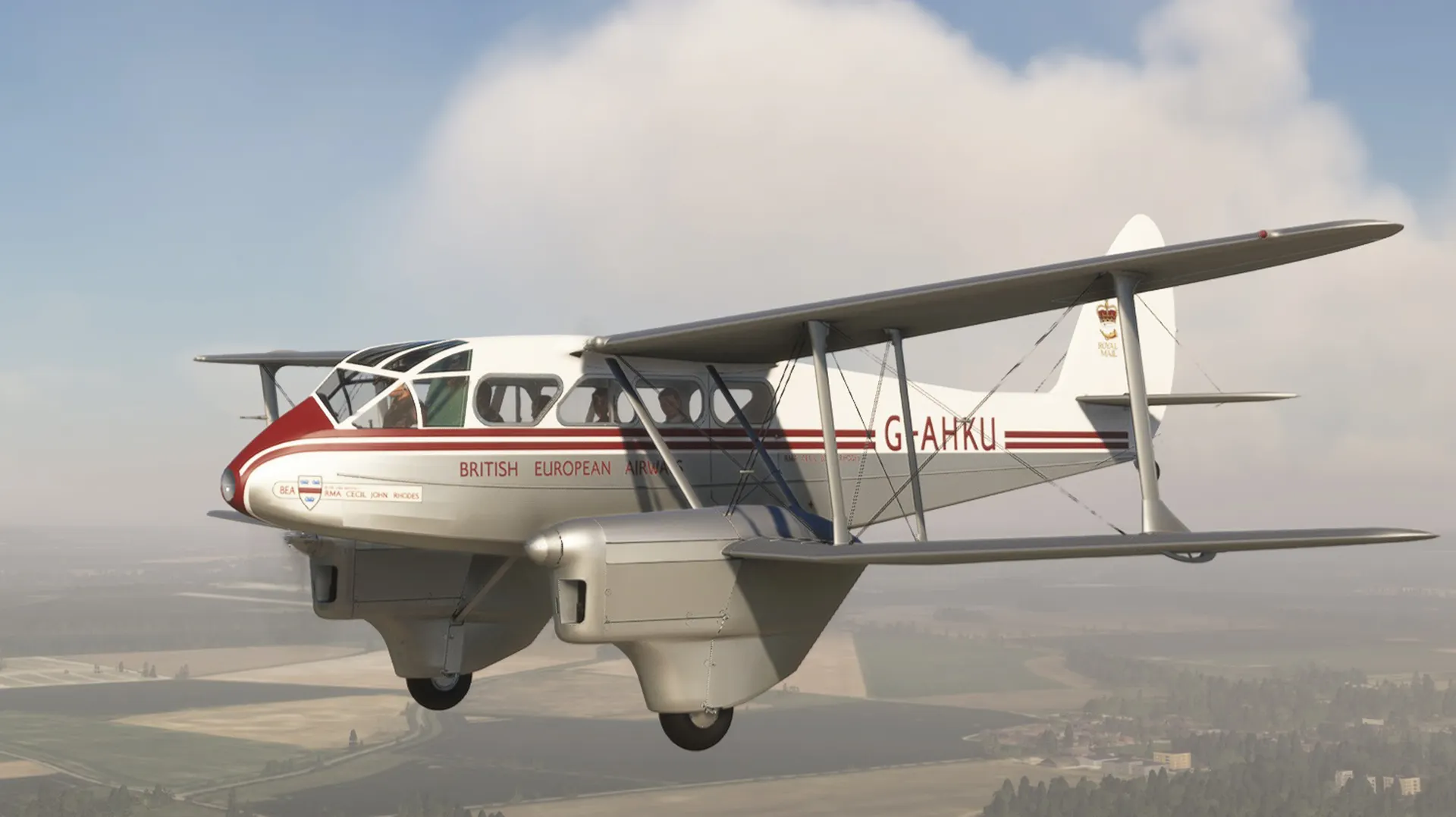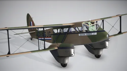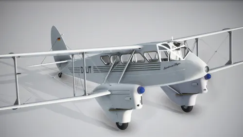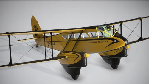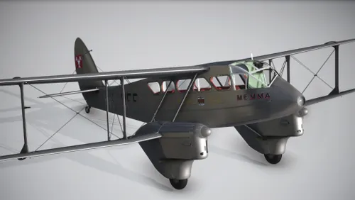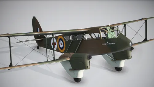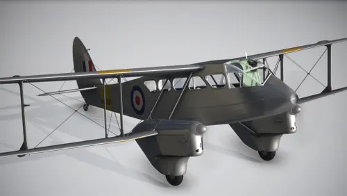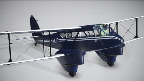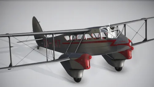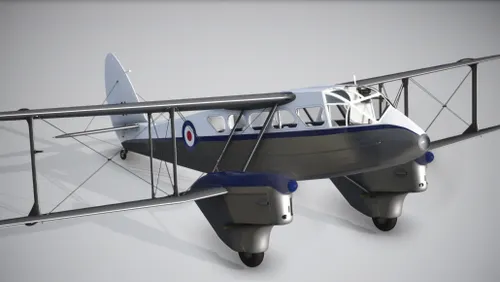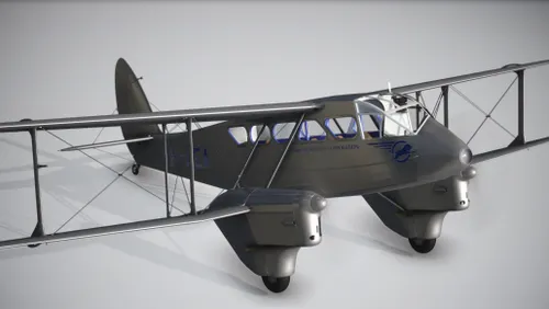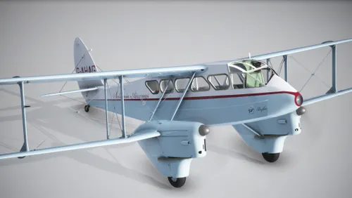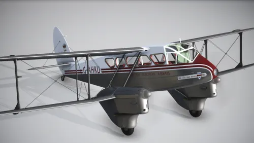 The de Havilland DH.89 Dragon Rapide was a twin-engine short-haul biplane transport introduced in 1934, designed as an elegant evolution of the earlier DH.84 Dragon. Built primarily of wood with a plywood fuselage, fabric-covered wings, and fixed tailwheel undercarriage, the Rapide combined light weight with remarkable durability. It was powered by two 200-hp de Havilland Gipsy Six inline engines, giving a cruising speed around 130 mph (210 km/h), a range of about 570 miles (915 km), and seating for six to eight passengers plus a pilot. The wings featured spruce spars and plywood ribs, with the upper and lower panels joined by interplane struts and bracing wires, while the tail surfaces were cantilever wooden structures.