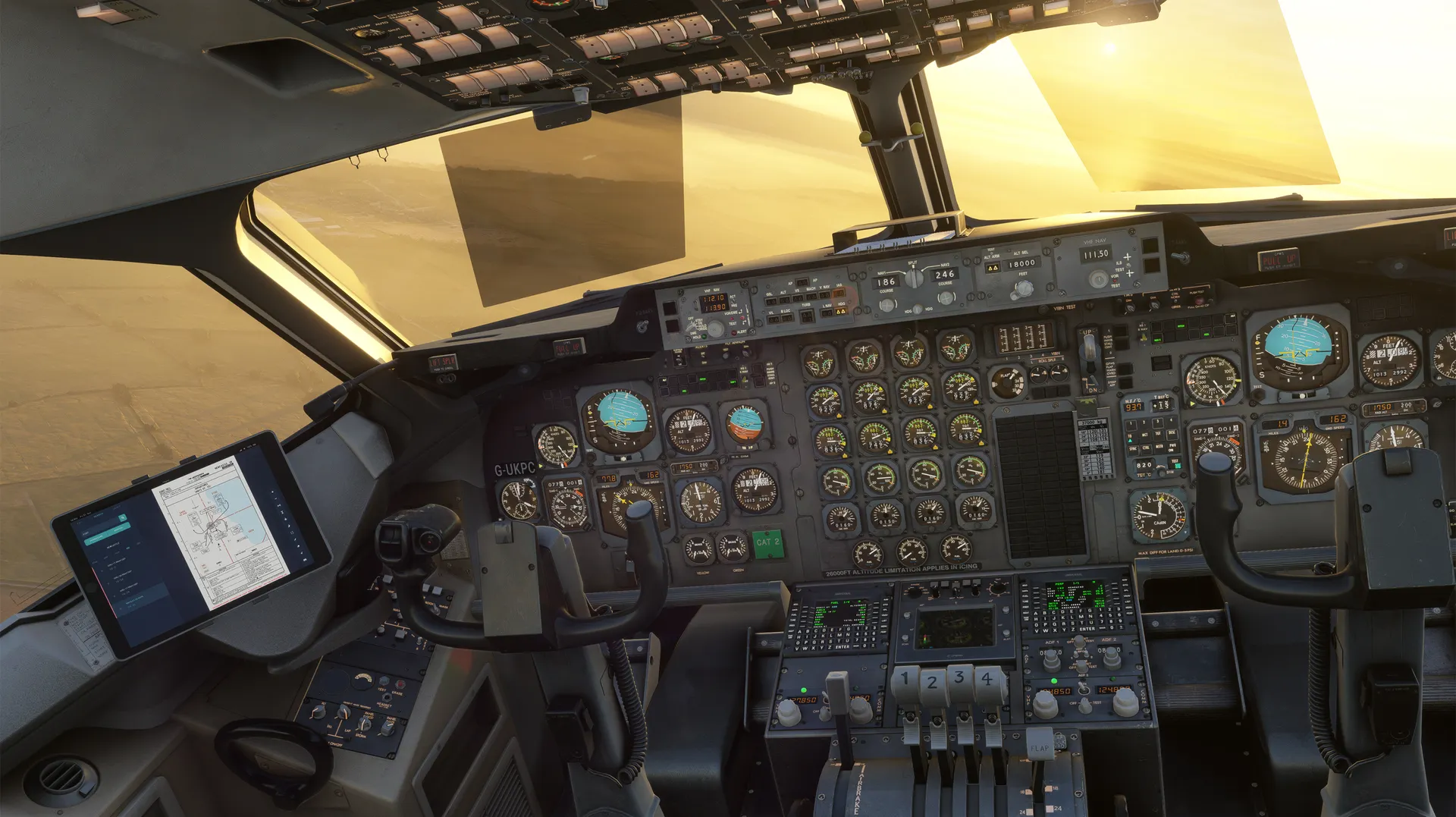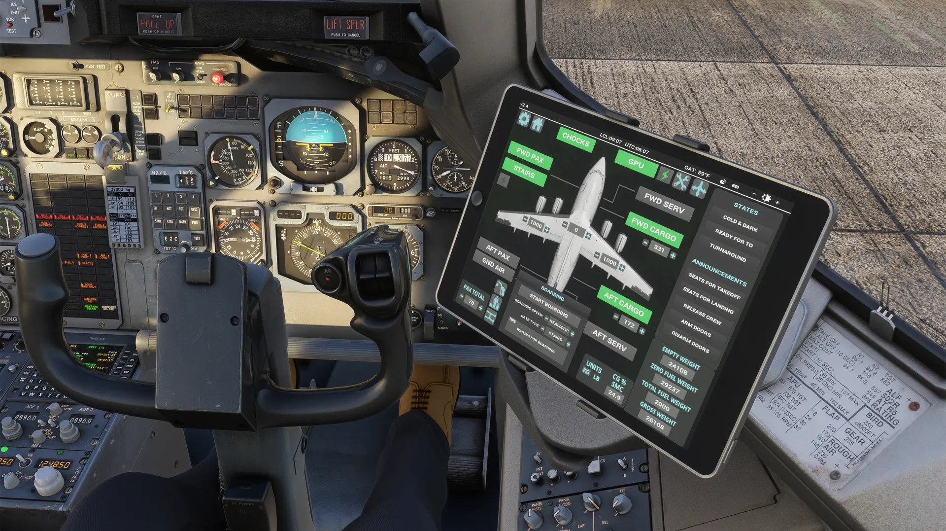 - Tablet EFB for controlling aircraft options and payloads, boarding simulation, failures, pushback controls, and SimBrief OFP and Navigraph charts support