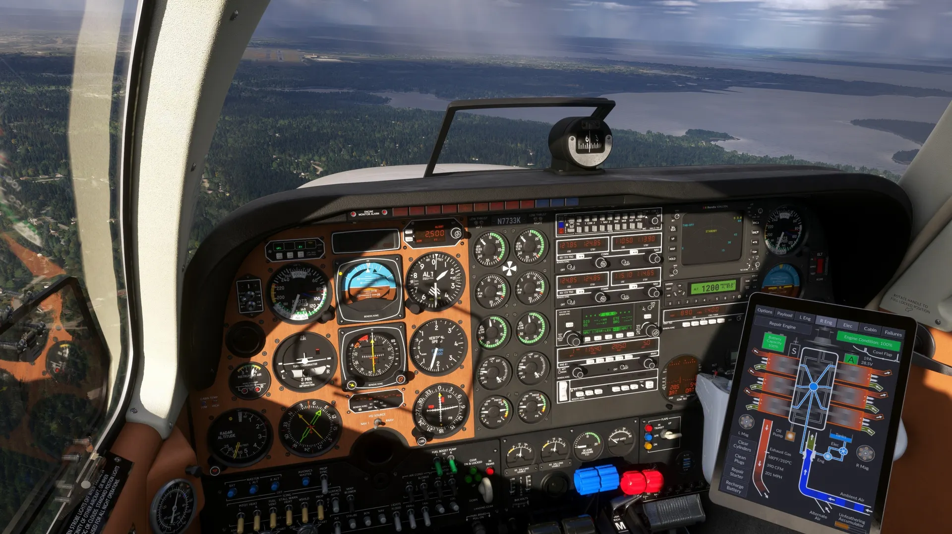 Black Square's new tablet interface lets you configure all options, manage payload, control failures, and monitor engines, electrical schematics, and environmental control systems, all from within the simulator. The failure system allows for persistent wear, MTBF, and scheduled failures for nearly every component in the aircraft. The 3D gauges are affected by physics, and can even become stuck without engine vibration, requiring a tap on the glass to free them.