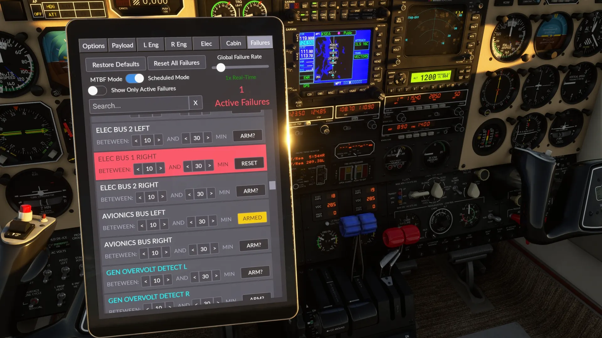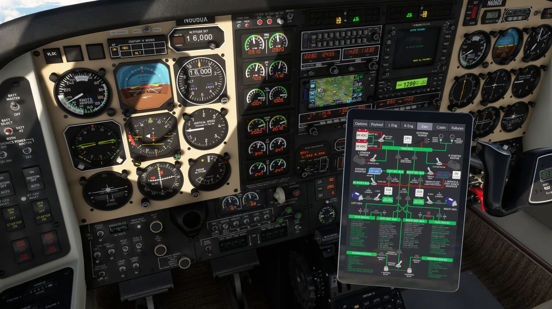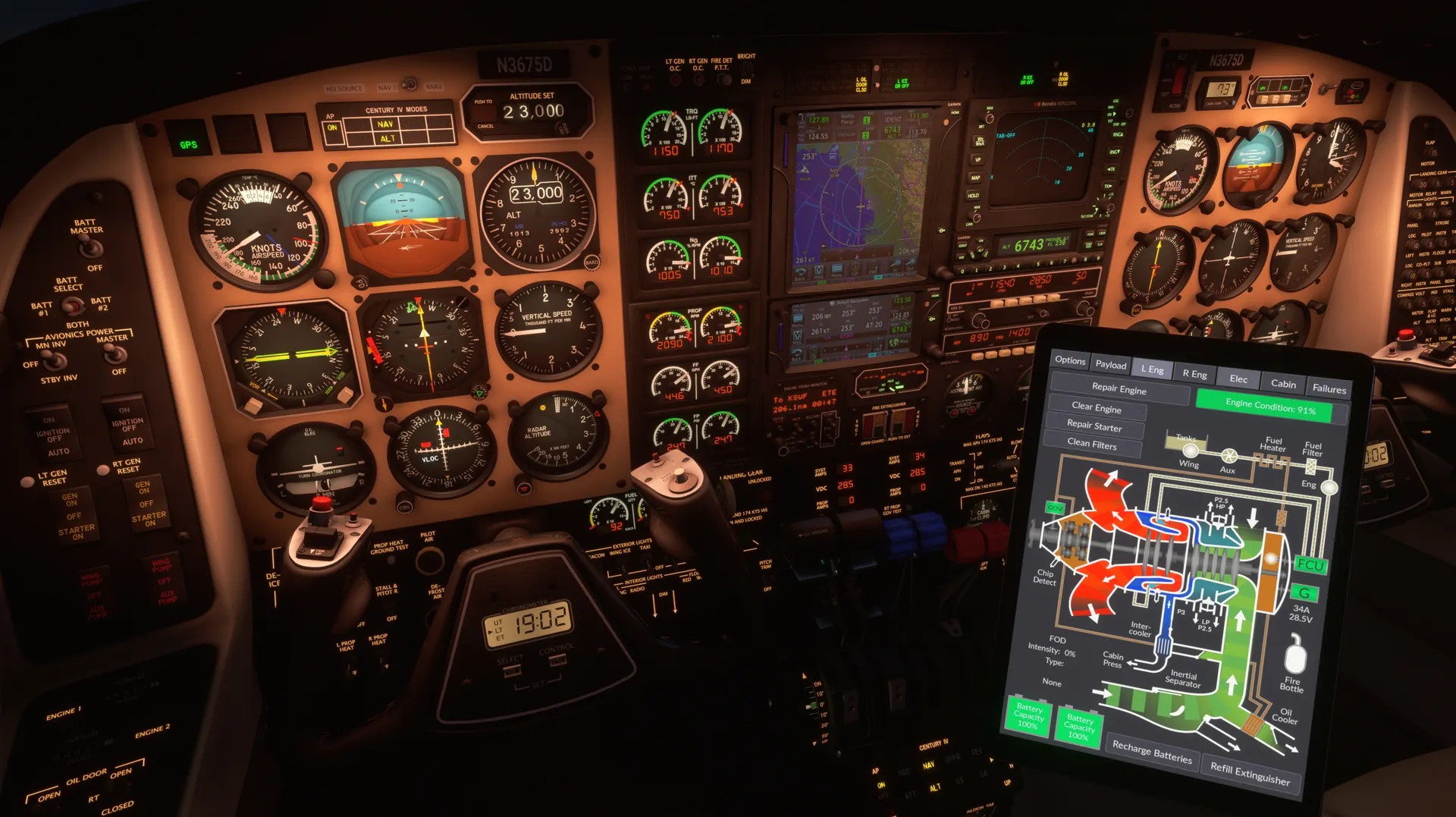 Black Square's new tablet interface lets you configure all options, manage payload, control failures and monitor engines, electrical schematics and environmental control systems, all from within the simulator. The failure system allows for persistent wear, MTBF and scheduled failures for nearly every component in the aircraft. The Turbine Duke's electrical system is the most accurate yet for Black Square, featuring a battery temperature monitor, over-voltage protection, over-current protection and AC inverters. The 3D gauges are modelled and coded to meticulously match their real-world counterparts, with reference to real-world manuals. No piece of equipment appears in a Black Square aircraft without a real-world unit as reference.