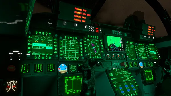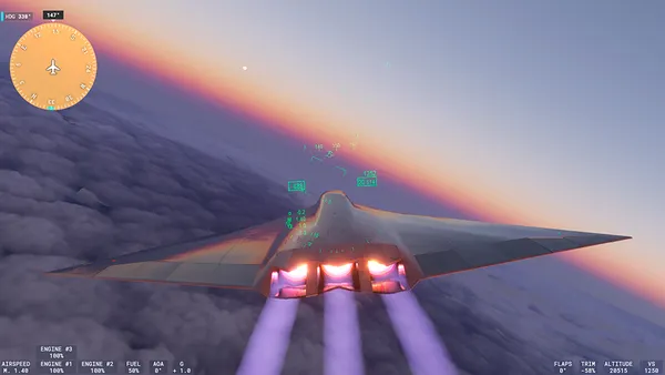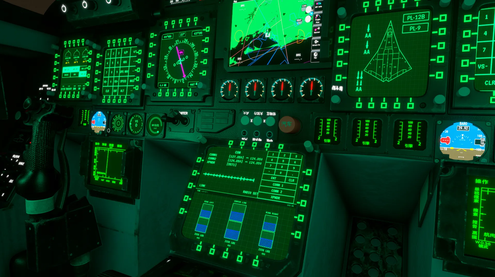 When you start on the runway, your aircraft will be ready for flight. If you're starting cold and dry, consider pressing the STARTER button on the panel in front of you. Wait 1 minute for the engine to fully ignite and monitor the EICAS (first screen on the left panel) as the engine RPM and temperature increase to the ideal level. In the meantime, you can experiment with the Chocks or GPU display. When taking off, consider briefly using the afterburner, as there will be ample power available due to the three engines in the fuselage. Using the Autopilot is simple, but requires prior guidance: you must click on the desired function before starting digitation to click enter. Use the ENT buttons to confirm what you've entered or the CLR button to clear and enter again. It is always necessary to click on the desired function before entering. Consider always starting to configure your AP by maintaining altitude, so first press the ALT button and then enter the desired value, and press ENT if the final value has less than 4 digits. Above 5 digits, the value is automatically applied by the AP. Next, set your desired speed or HDG, or even GPS navigation mode. If you want to remove speed control, click the A/T button in the upper right corner of the screen. Consider using the VS+ and VS- buttons to interact with climb mode. IMPORTANT: Avoid using Mach control during climbs to avoid constant acceleration and deceleration; During the climb phase, if you want to use A/T, use the normal SPEED control, in knots, and after stabilizing your altitude, change to Mach if you wish. The radio screen works similarly: click on the frequency type you want to change (COMM 1 or XPNDR) and enter the desired frequency, pressing ENT when finished, or CLR to clear your entry. Your MDF panel displays local time, landing gear status, navigation light status, and flap status. When landing, note that your landing speed may be low, less than 140 knots, due to the shape of the aircraft. There are filters and digital controls to make the flight more stable during this phase, but some caution and skill are recommended for a safe landing. Quick View 5 in the cockpit is a fixed camera on the outside of the aircraft with a HUD, for tactical flight similar to aerial combat games.
