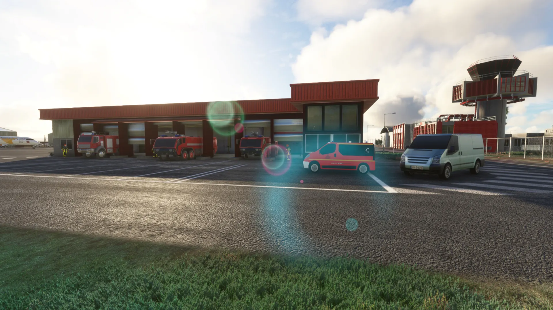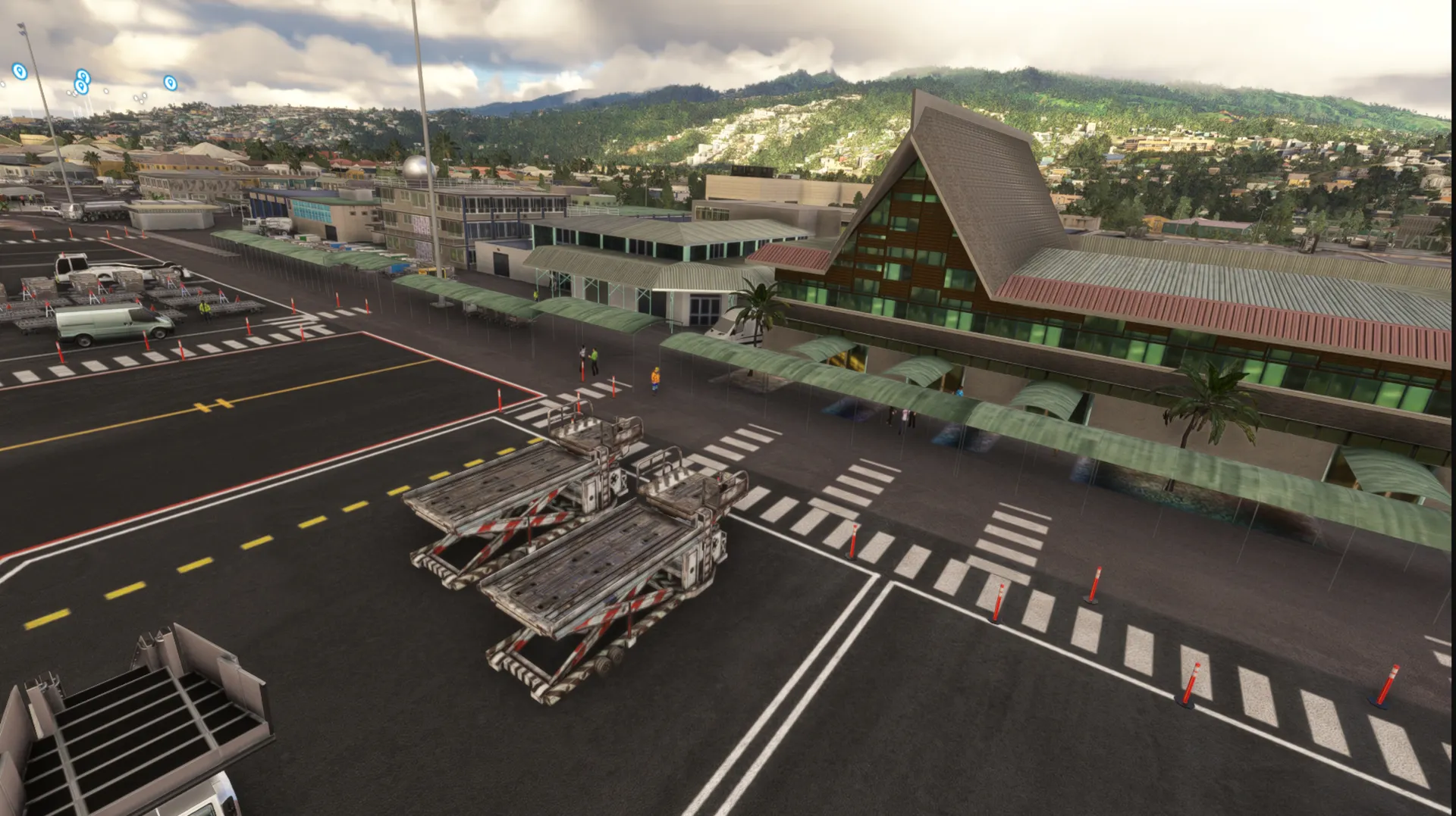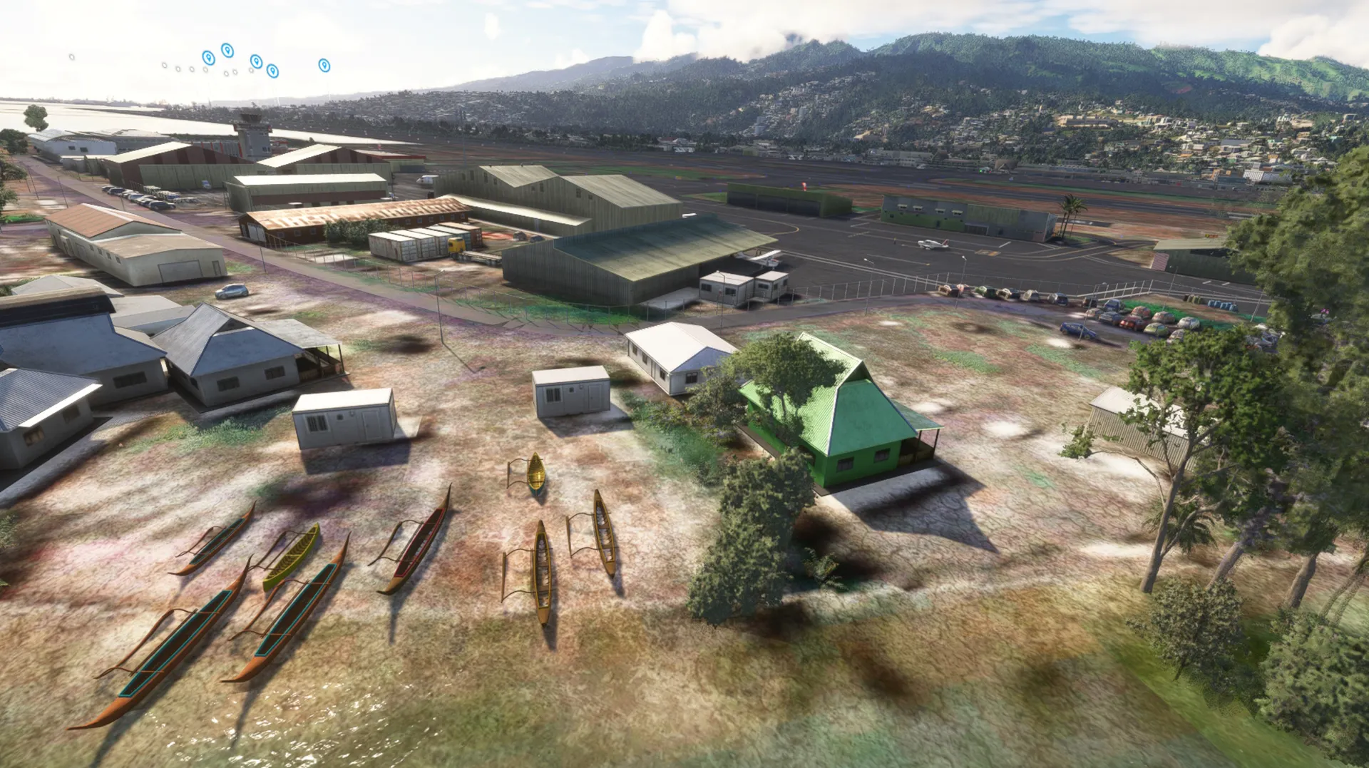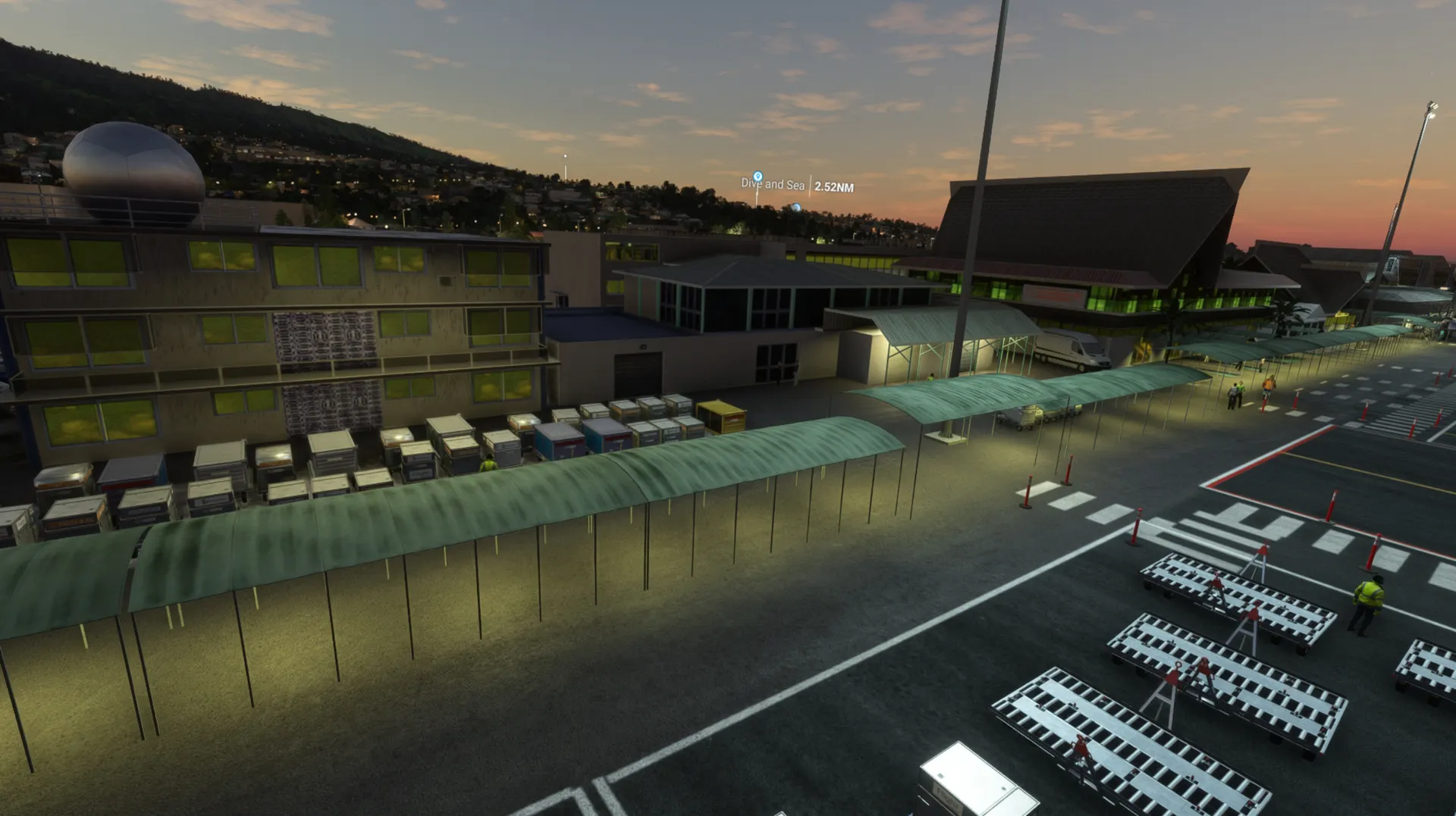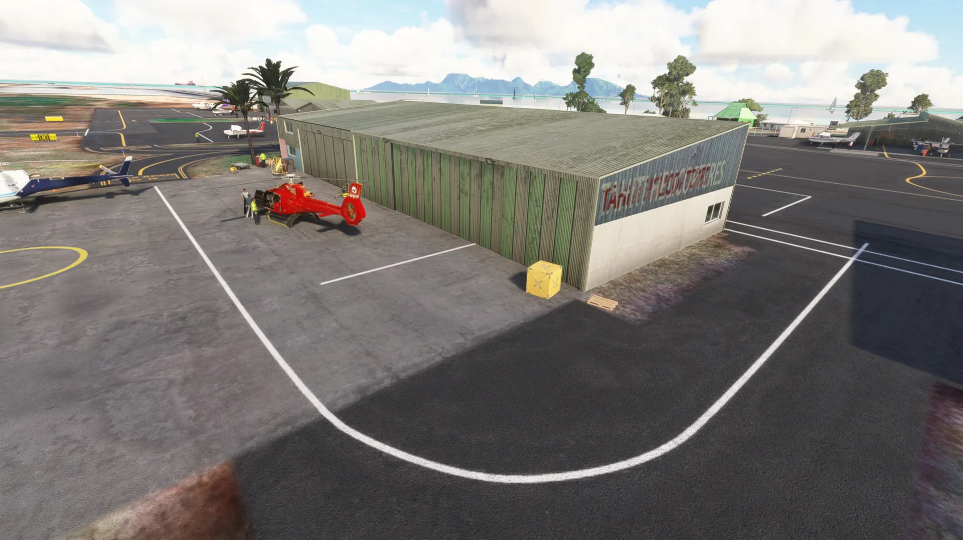 3D custom buildings PBR and night texture, New ground photo remove the default MSFS landclass Realistic Ground Texture, markings and parkings according last charts Water mask extend the default MSFS reef to the seaport area, Animations and peoples populate the area Sound on open hangars.