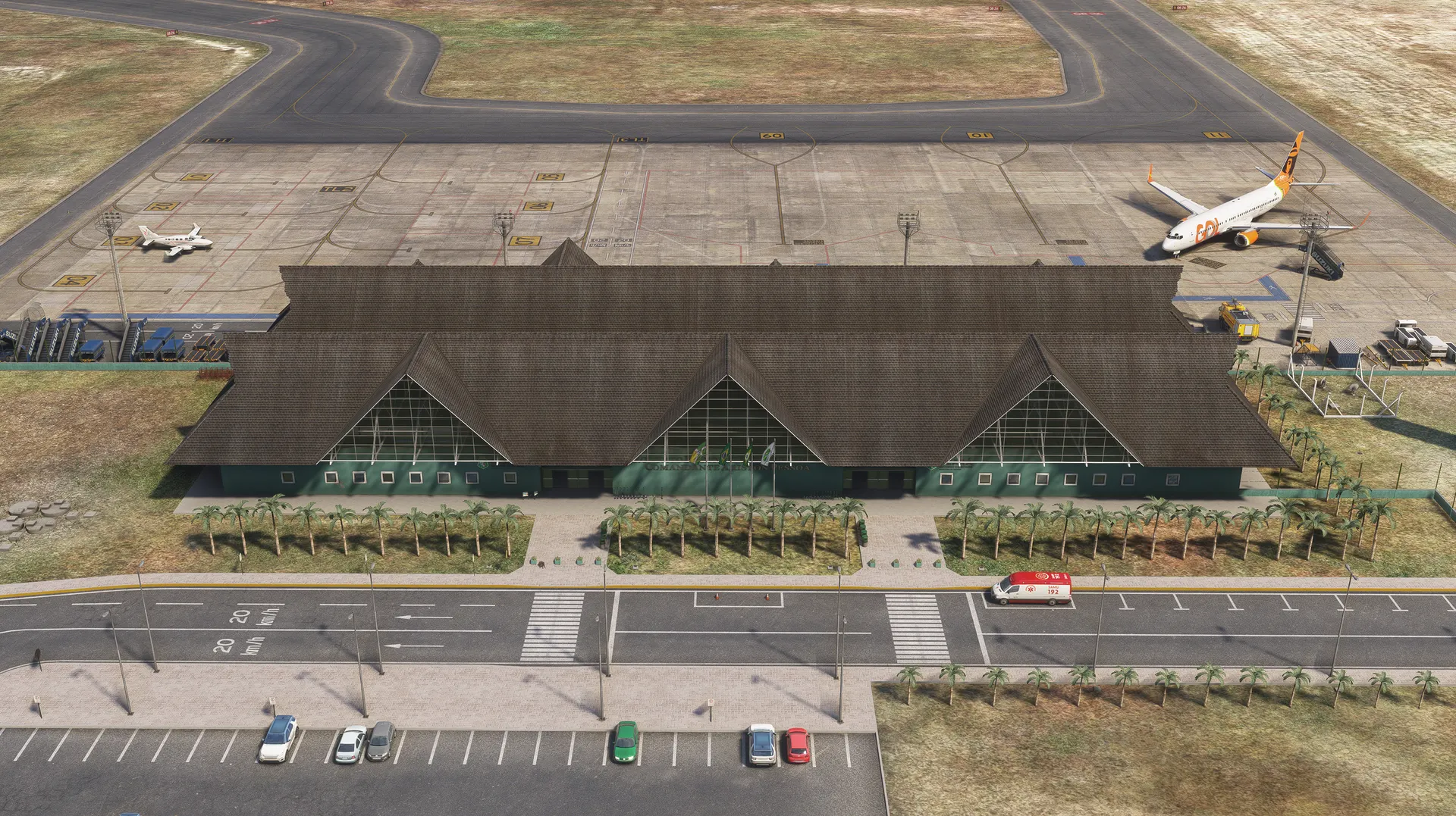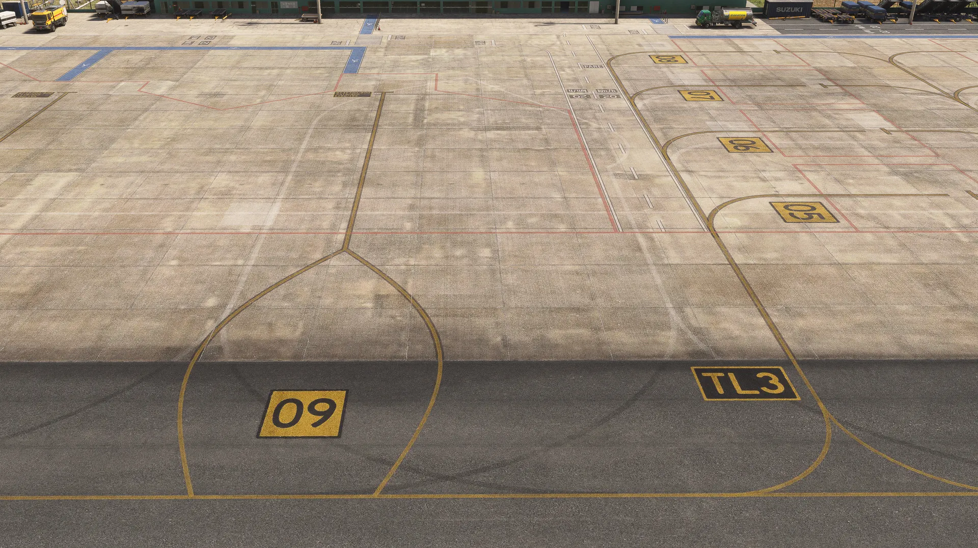 - Detailed apron, taxiways, and runway materials with weathering;