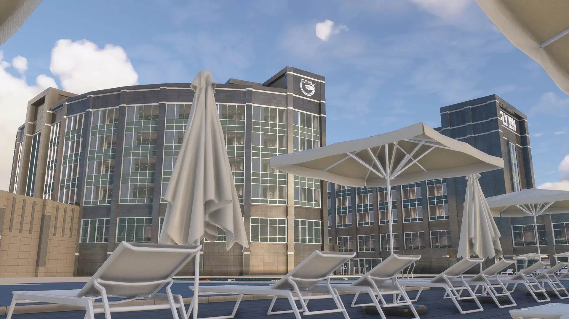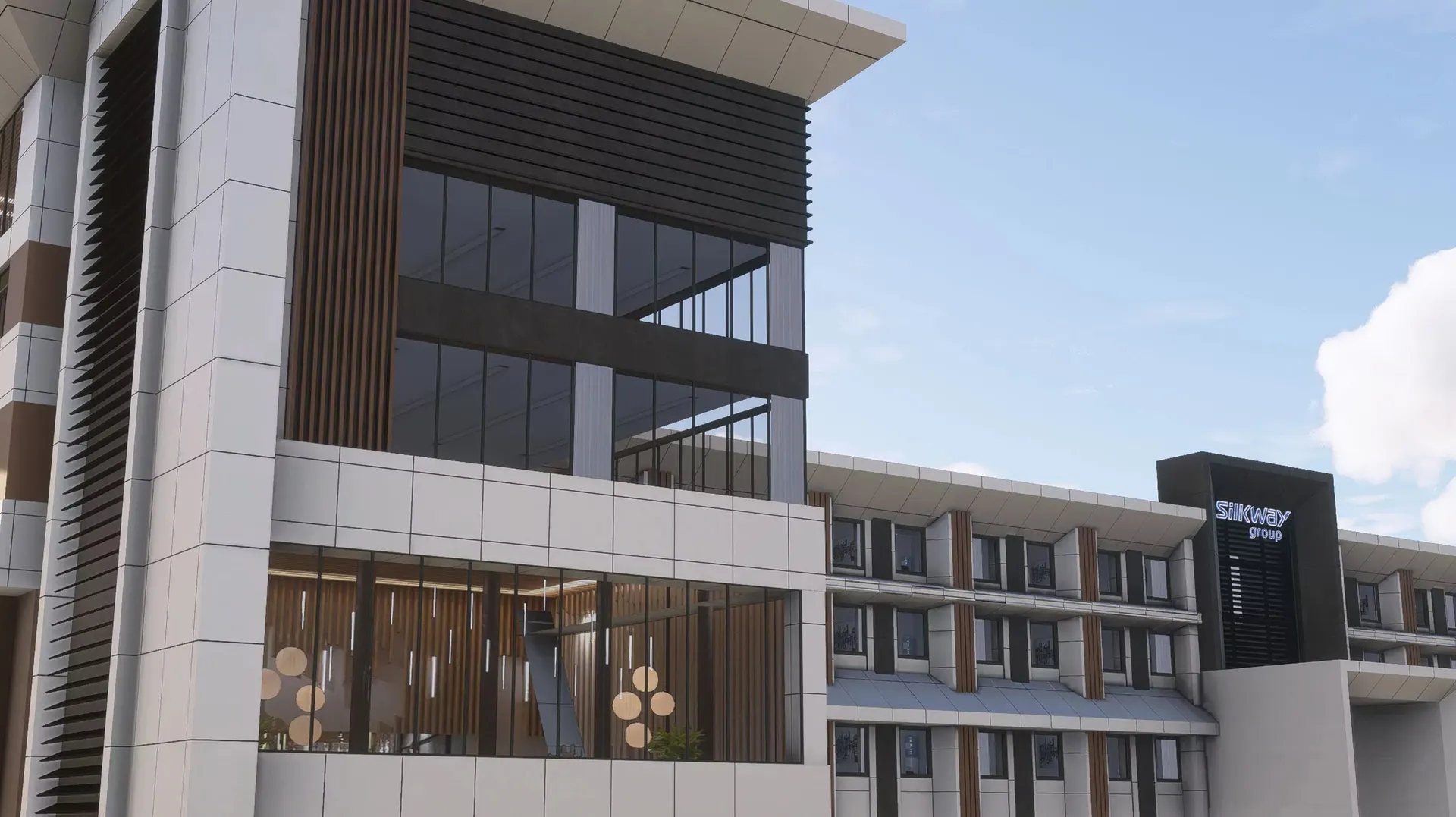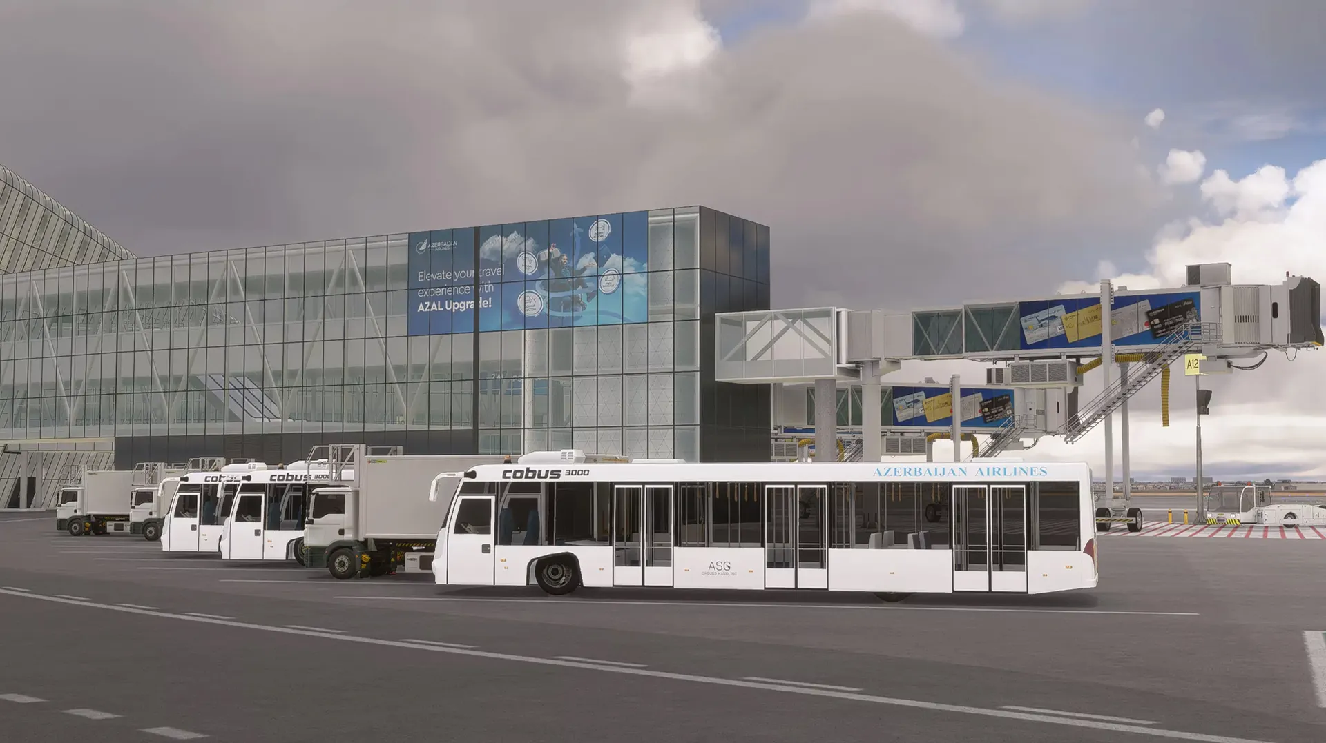 Attention to detail extends down to the smallest elements: custom-modeled Cobus shuttles, service vehicles, and ground props populate the airport, creating an authentic operational atmosphere. Every building, structure, and asset has been designed to replicate the unique architectural character of Heydar Aliyev International.
