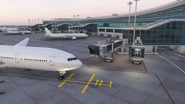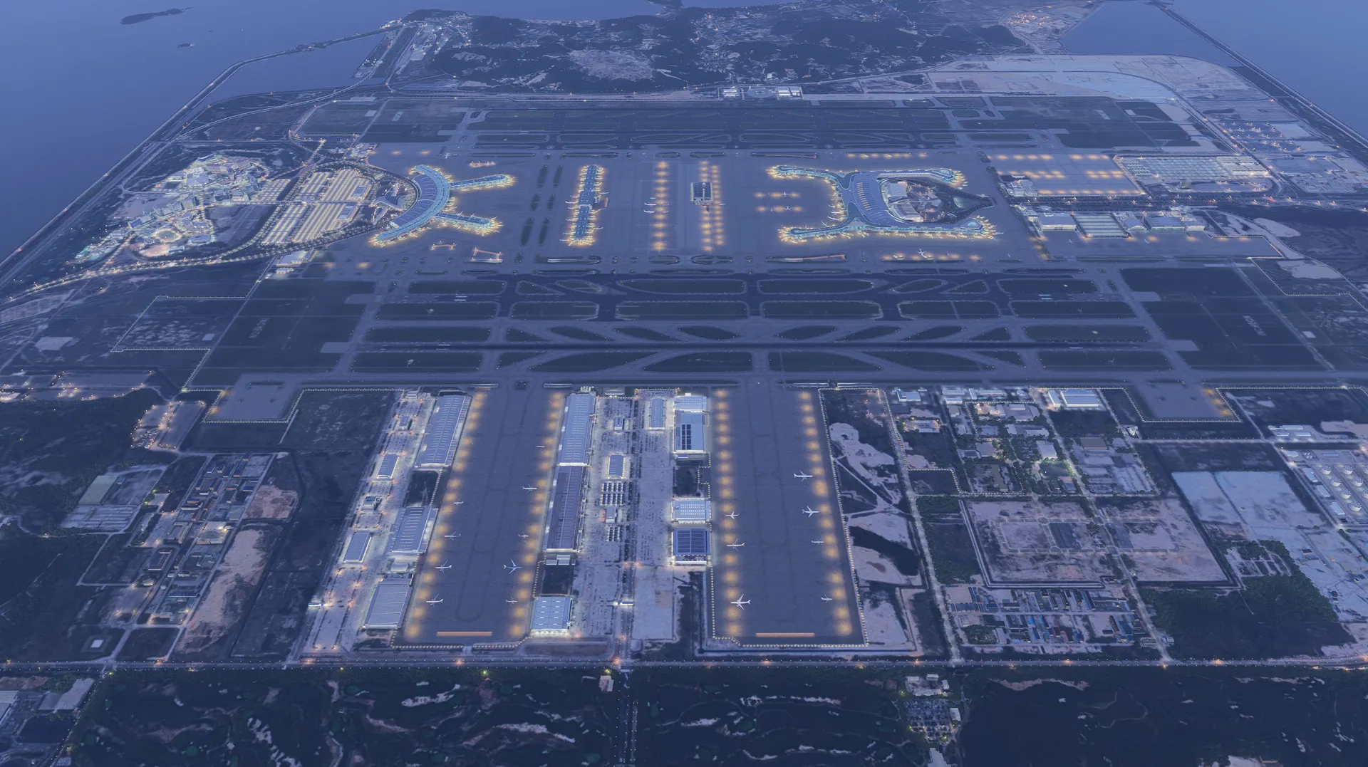 - Realistic custom ground polygons, jetways, lighting, and night illumination.