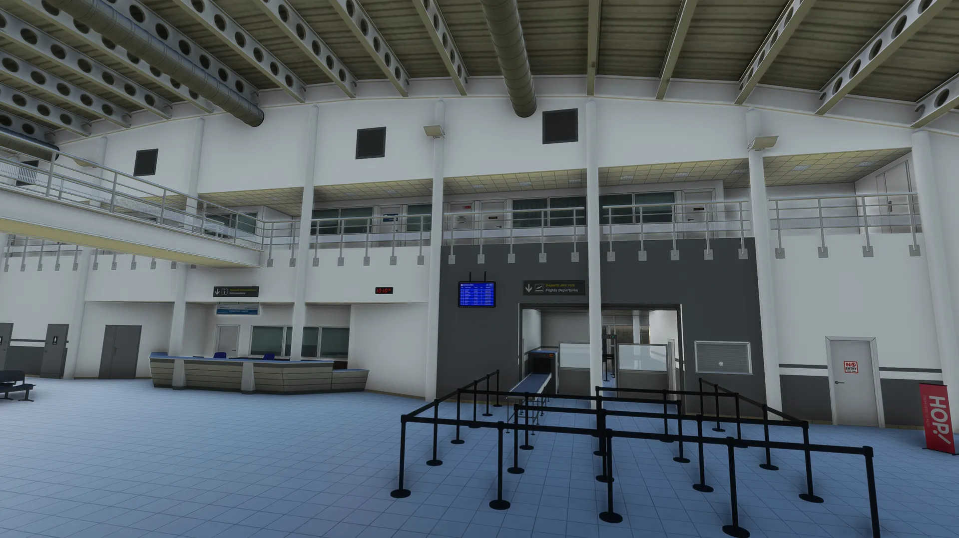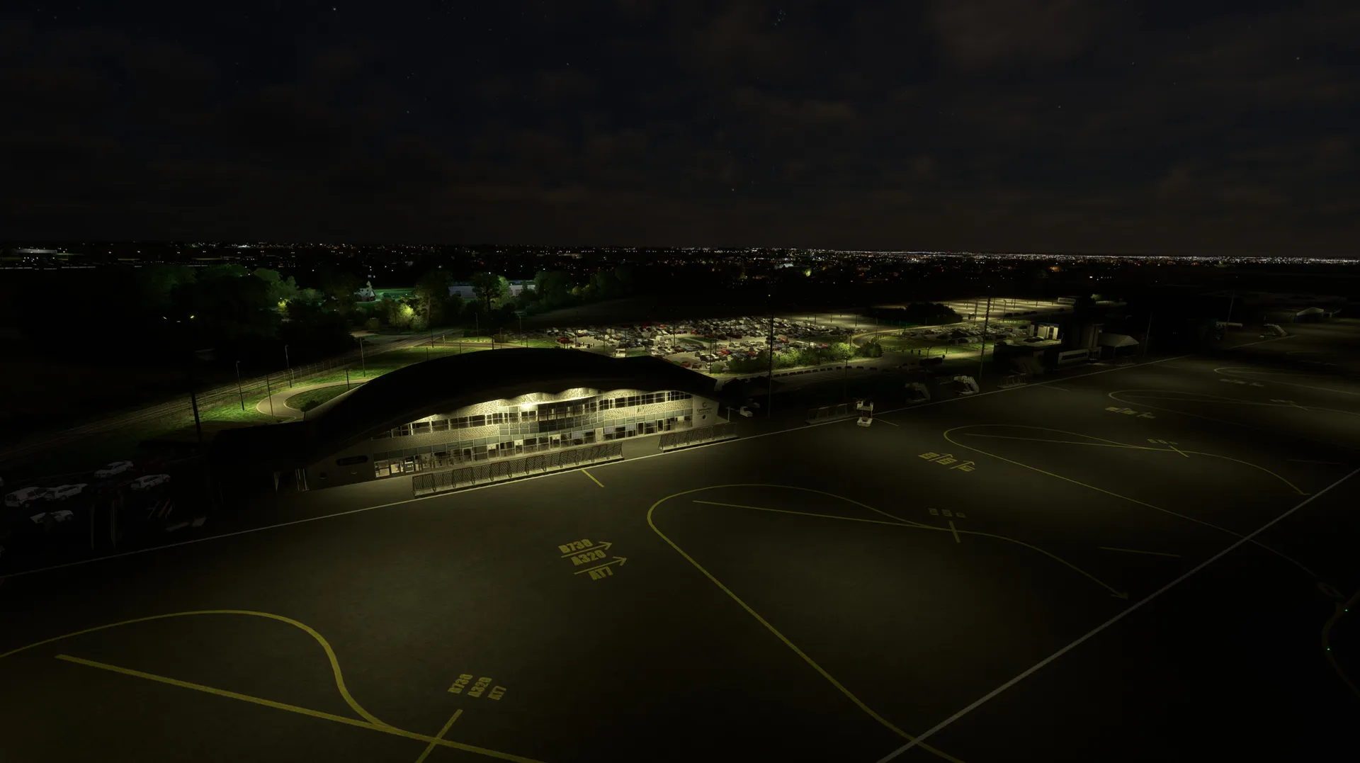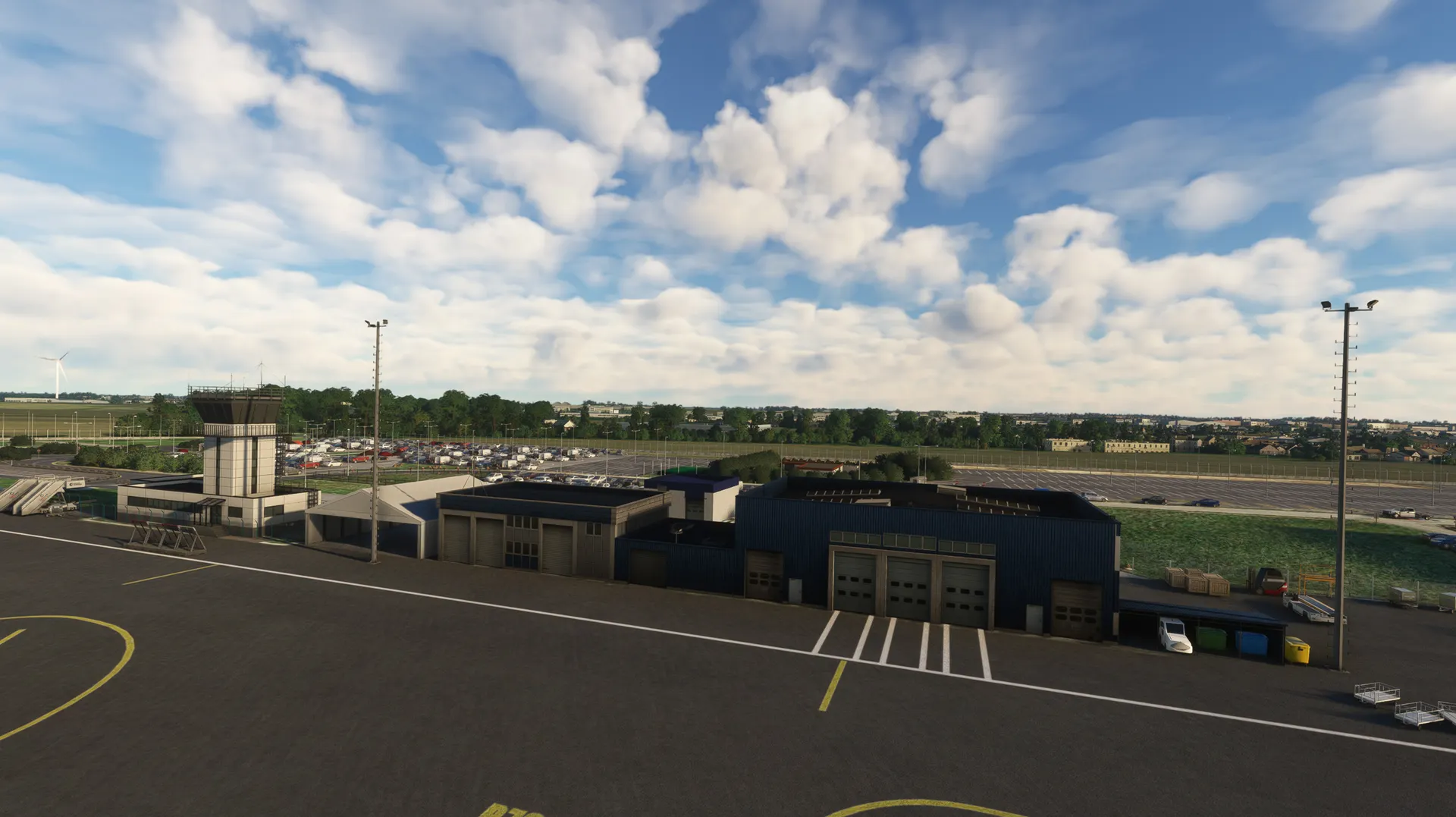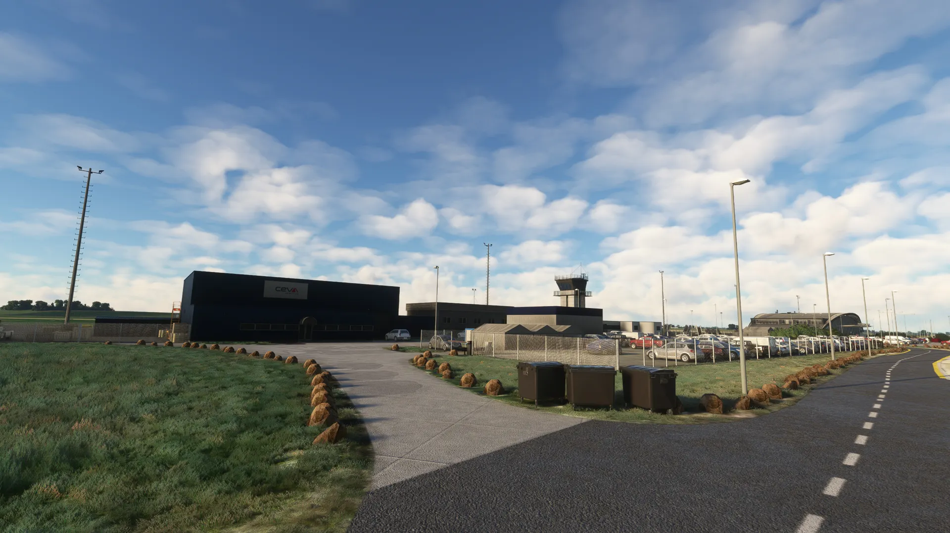 Custom aerial image of the airport area Custom ground layout according to navigraph charts (Projected mesh) High detailed terminal building including fully modelled interiors High detailed tower building including interiors All airport building are custom modelled and textured Higly detailed land side area (Termianal exteriors and parking lots) Custom modelled nearby industrial area All objects are custom placed and handcrafted