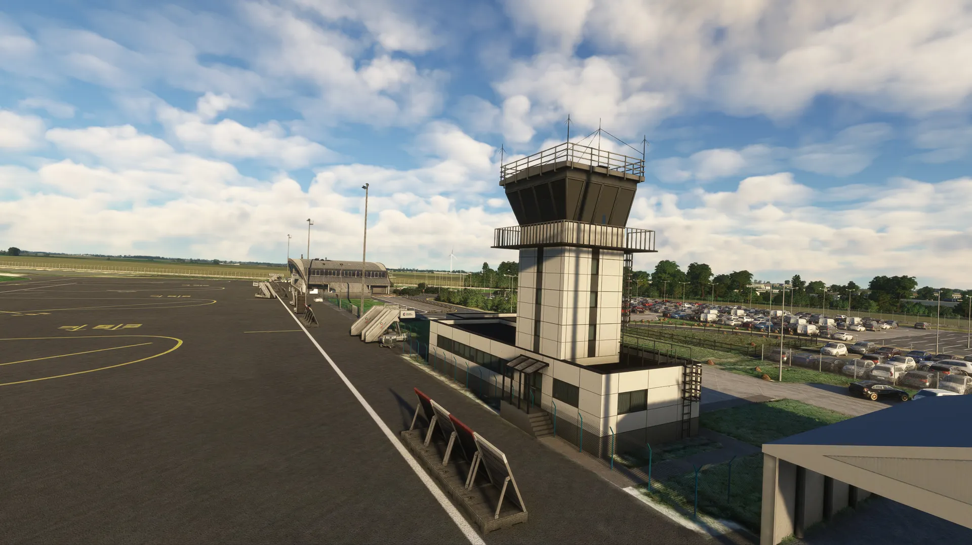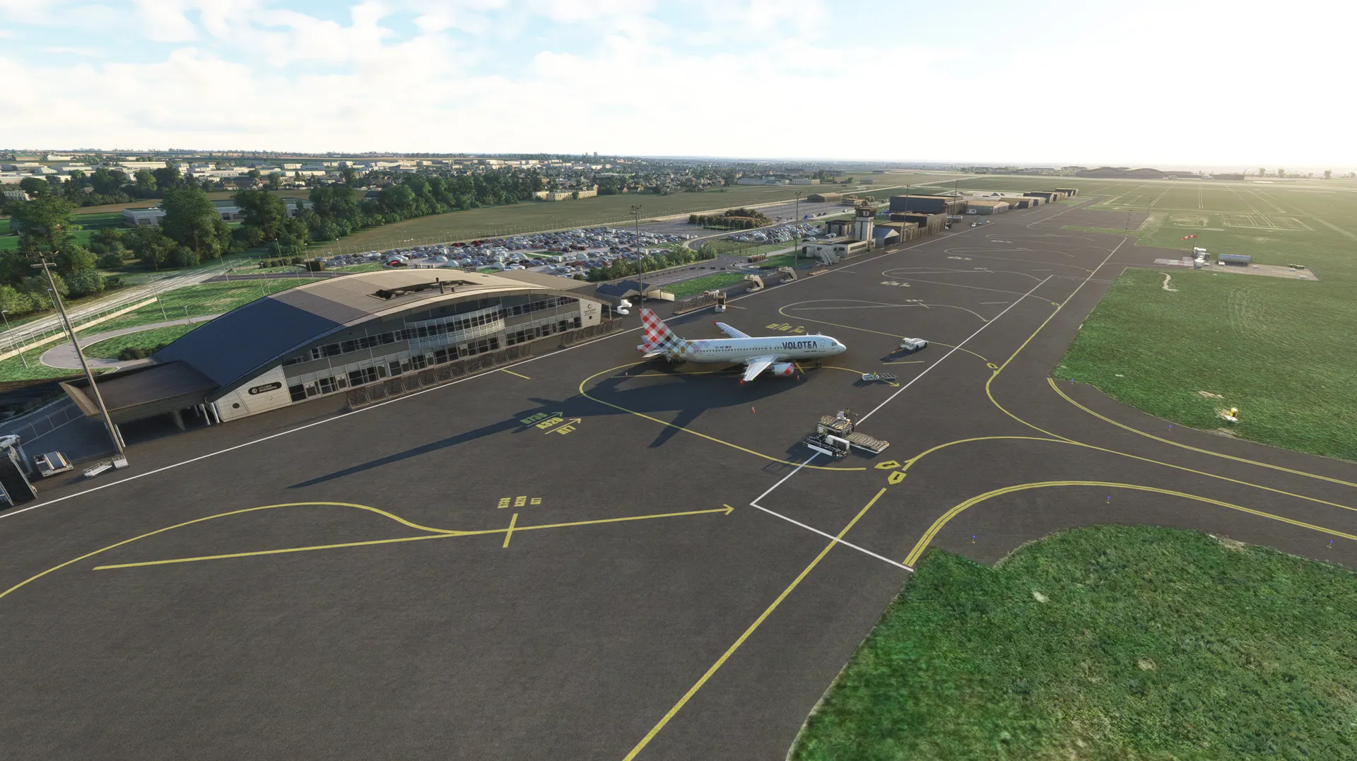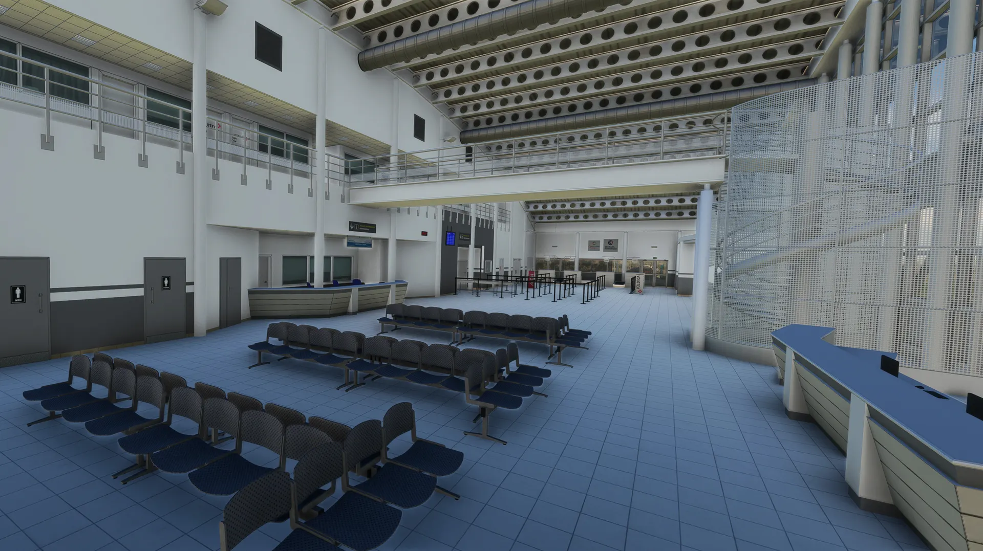 Custom aerial image of the airport area Custom ground layout according to navigraph charts (Projected mesh) High detailed terminal building including fully modelled interiors High detailed tower building including interiors All airport building are custom modelled and textured Higly detailed land side area (Termianal exteriors and parking lots) Custom modelled nearby industrial area All objects are custom placed and handcrafted