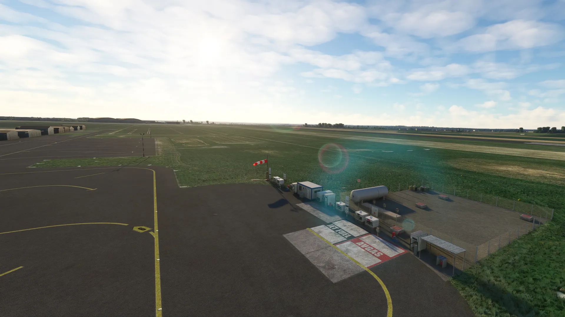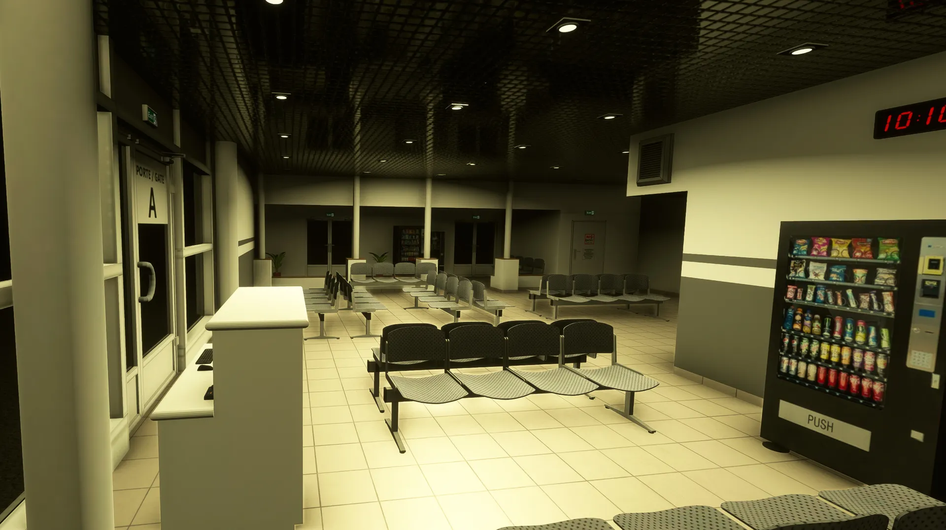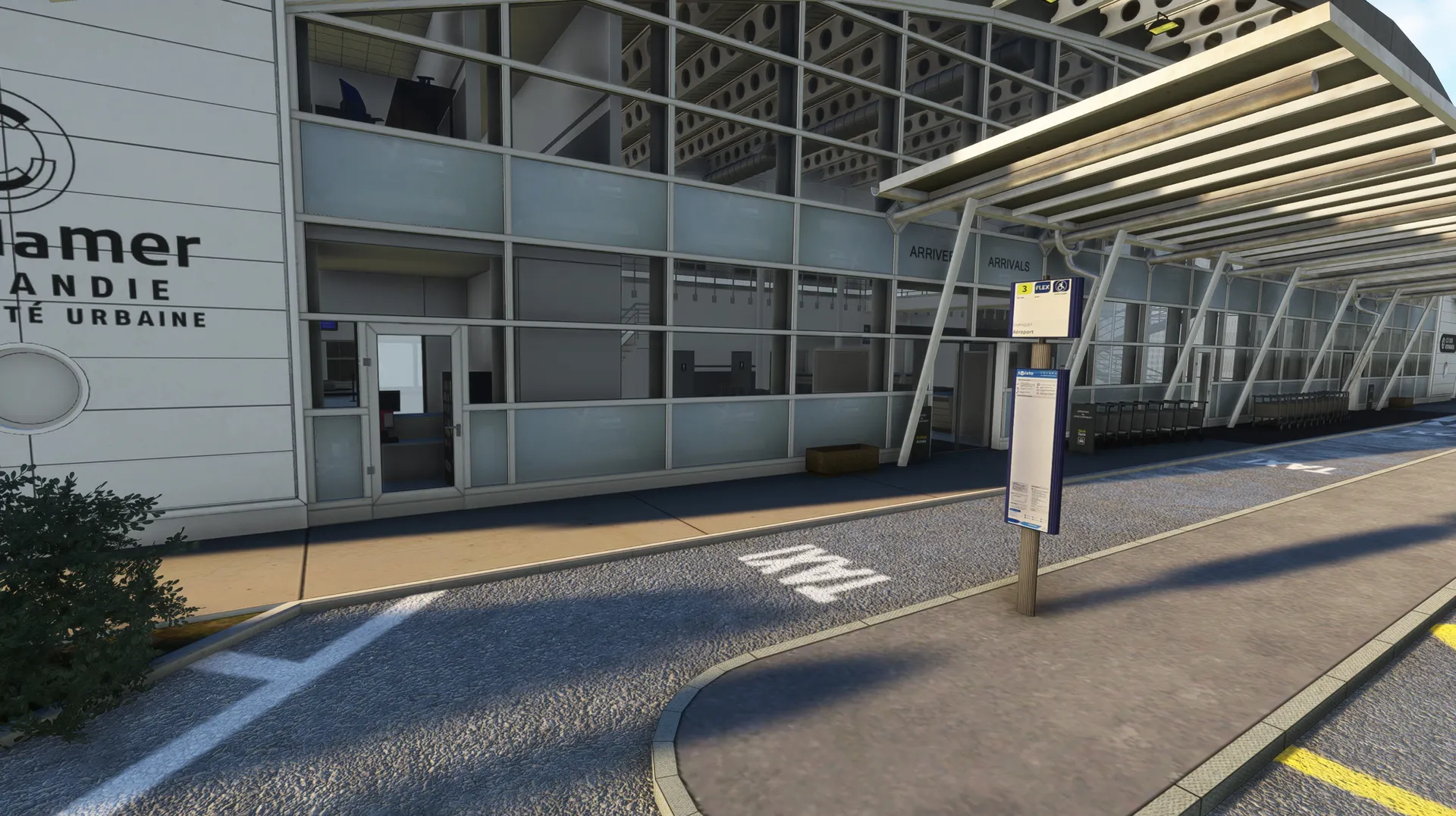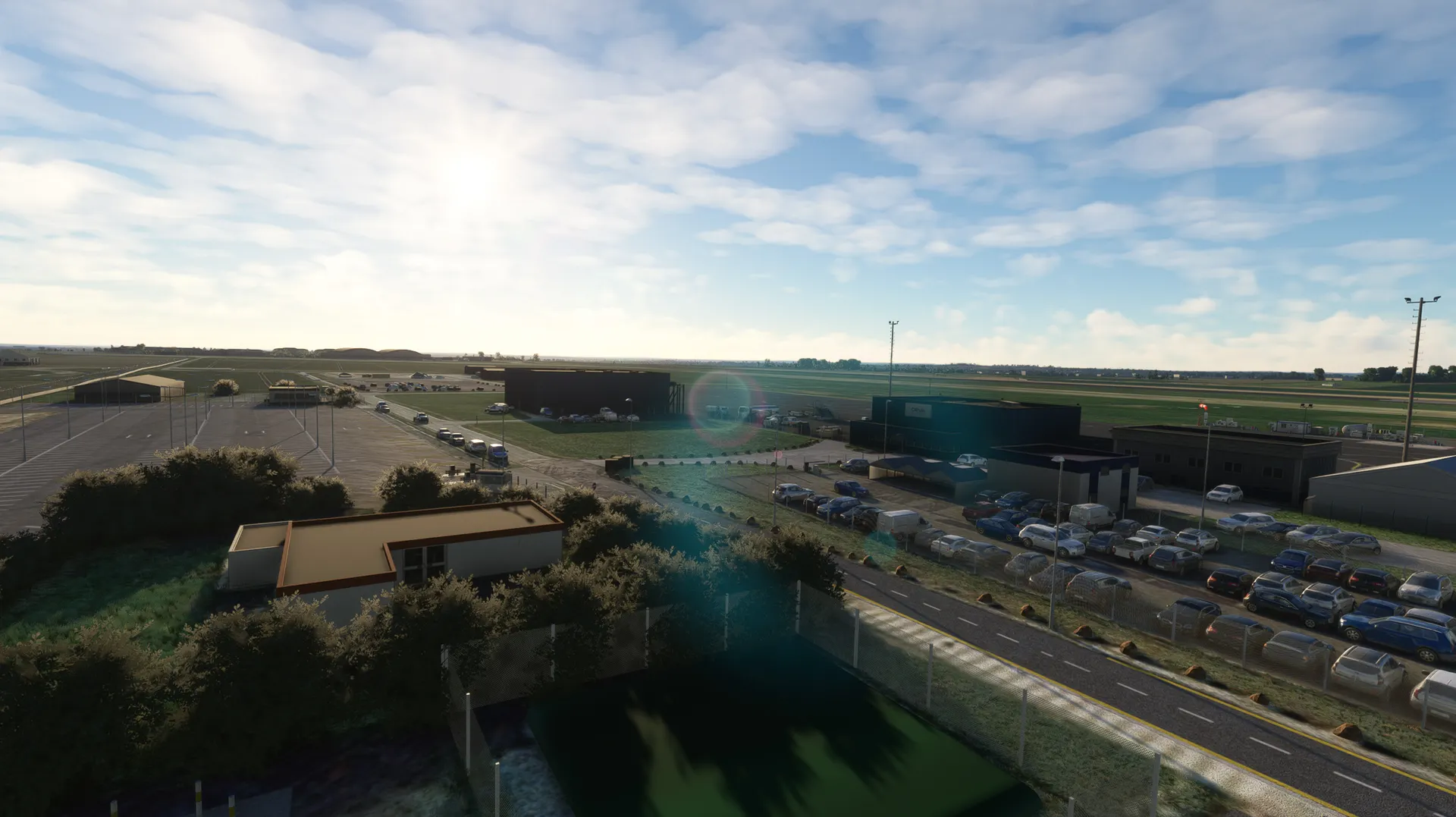 Custom aerial image of the airport area Custom ground layout according to navigraph charts (Projected mesh) High detailed terminal building including fully modelled interiors High detailed tower building including interiors All airport building are custom modelled and textured Higly detailed land side area (Termianal exteriors and parking lots) Custom modelled nearby industrial area All objects are custom placed and handcrafted