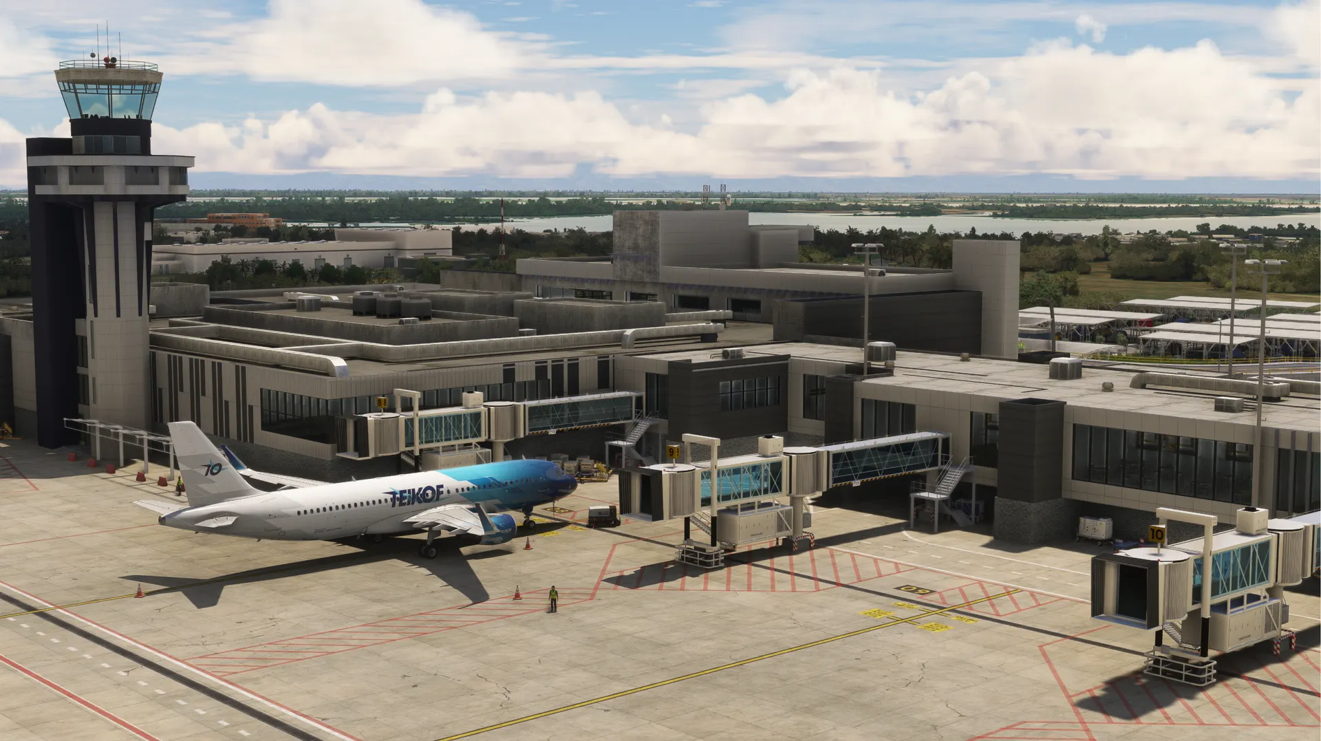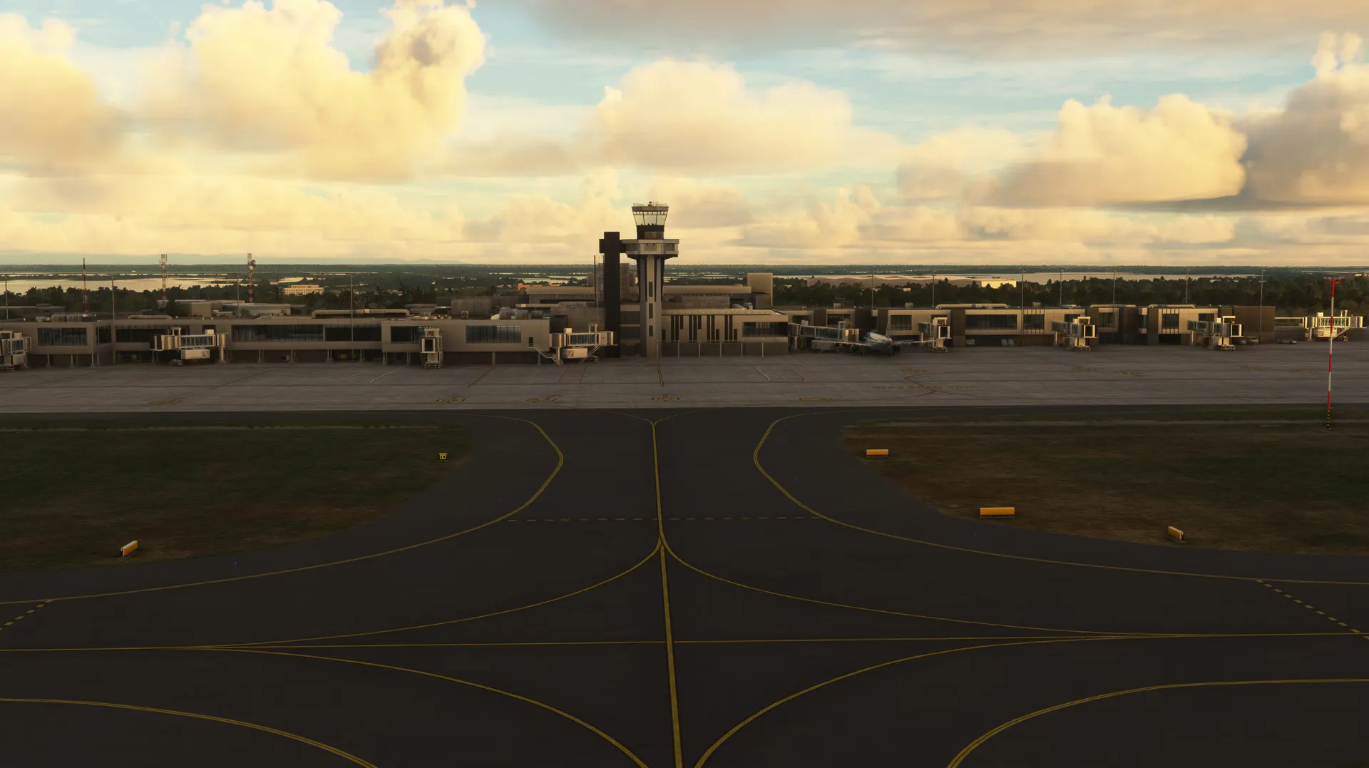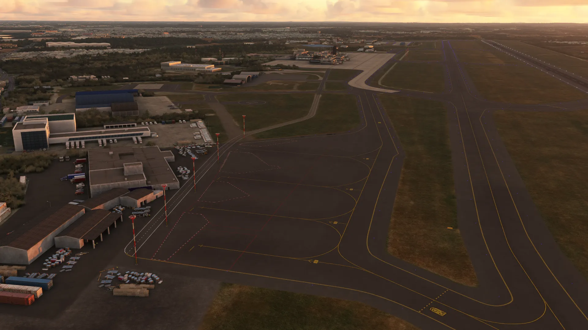 Custom ground markings, taxiways, and runways, matching real-world layouts.