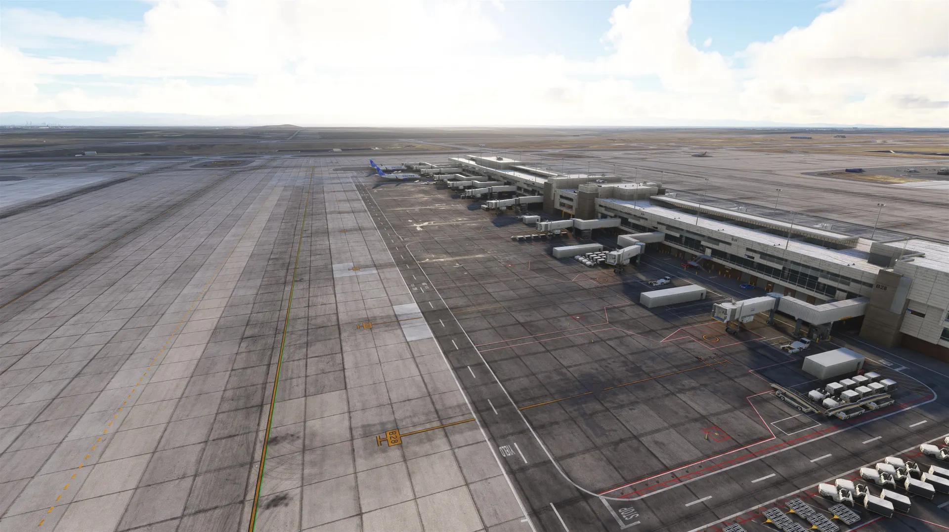 - Accurate taxiway, runway, and service vehicle markings that closely follow FAA standards
