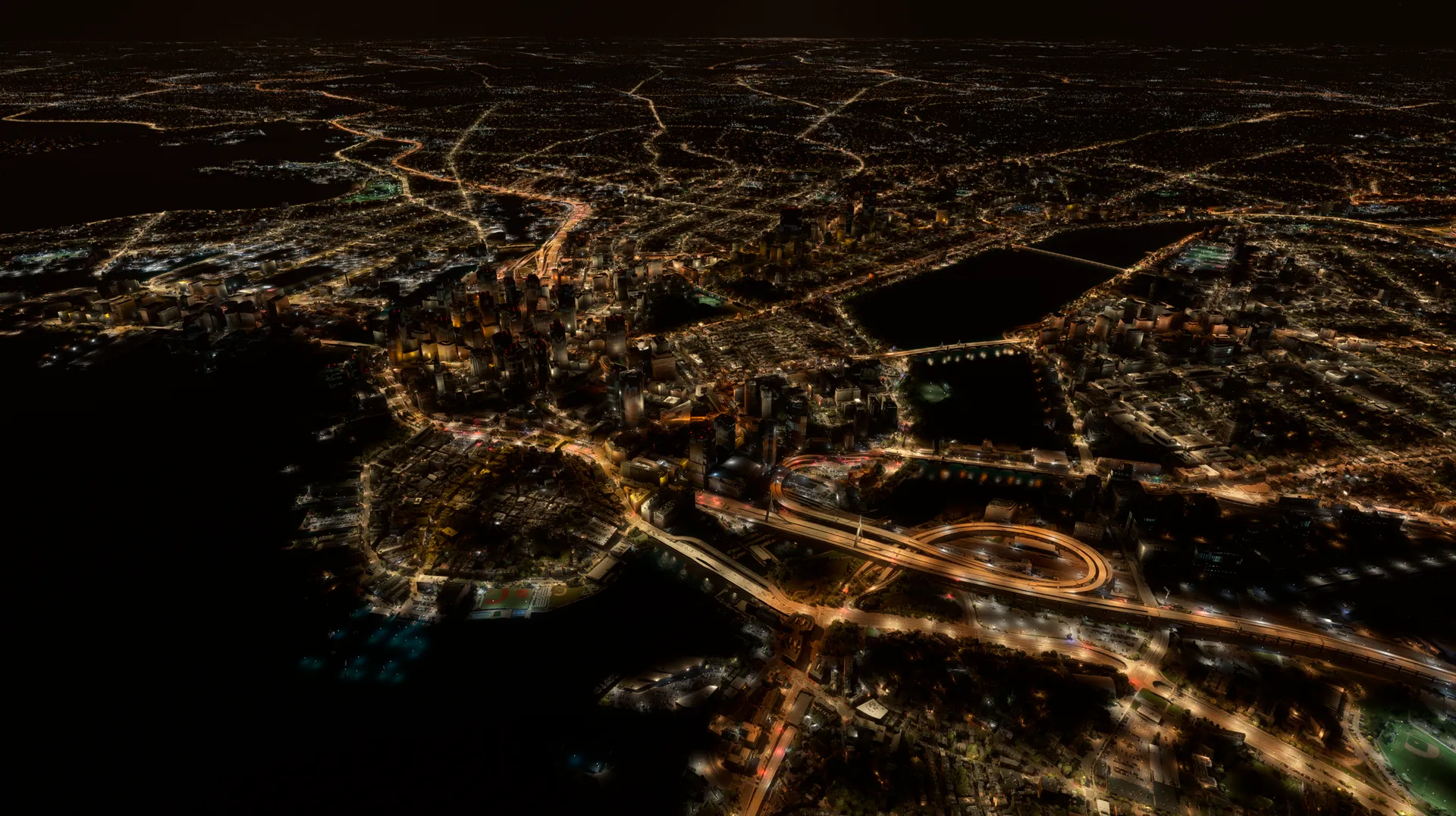 From the illuminated approaches surrounding Logan International Airport (KBOS) to the intricate highway system crossing the Charles River and Boston Harbor, roads become more recognizable from altitude, improving situational awareness during night IFR and VFR operations.
