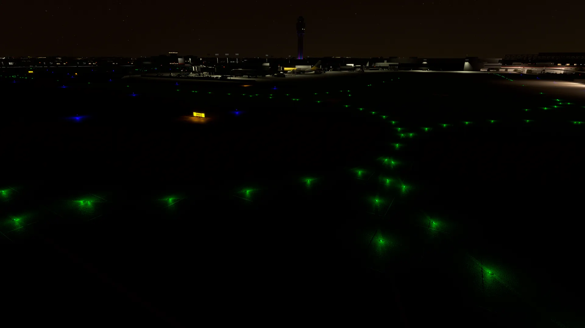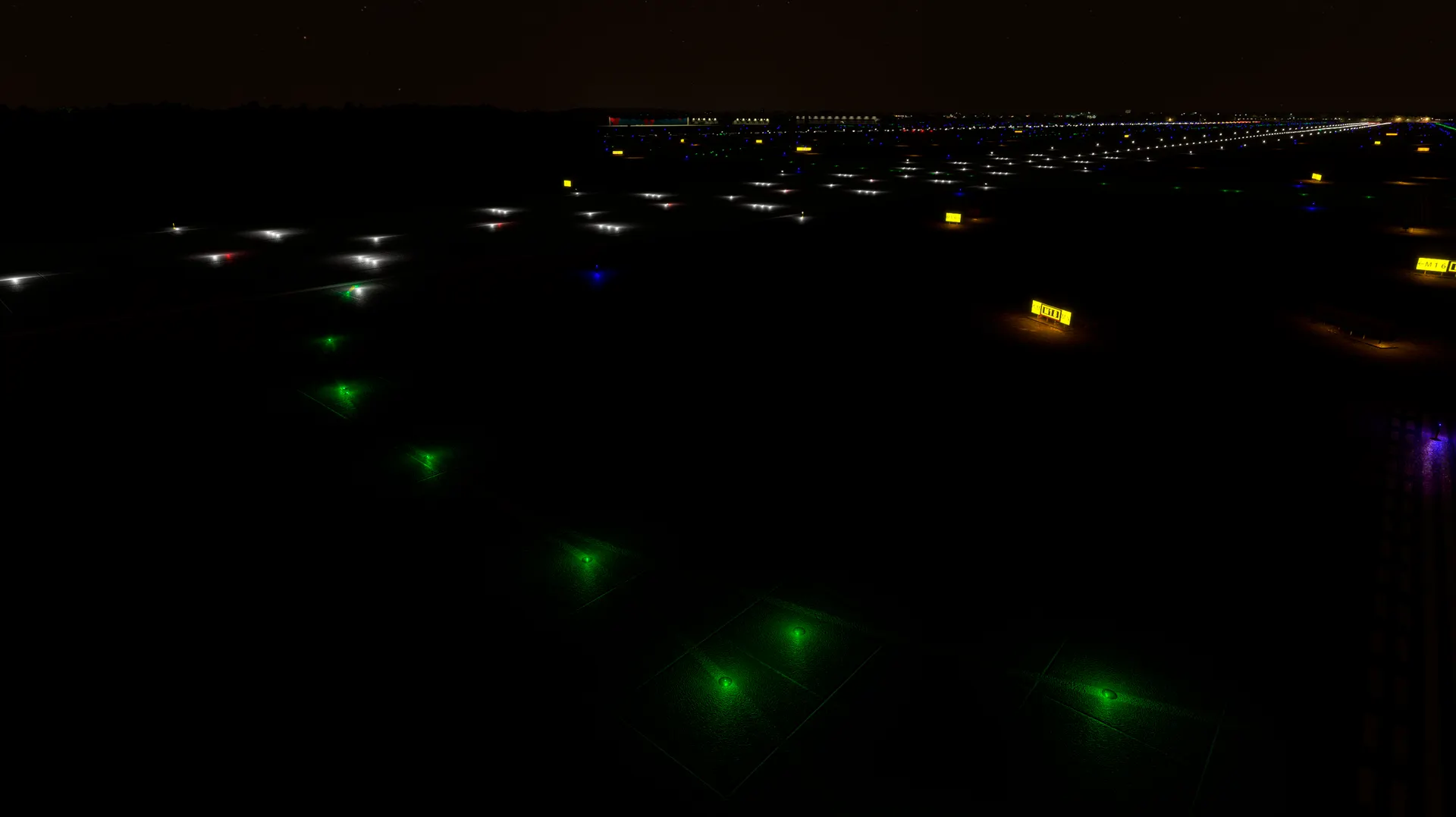 Taxiway Centerline Lights (green): center of the runway illuminated with surgical precision.