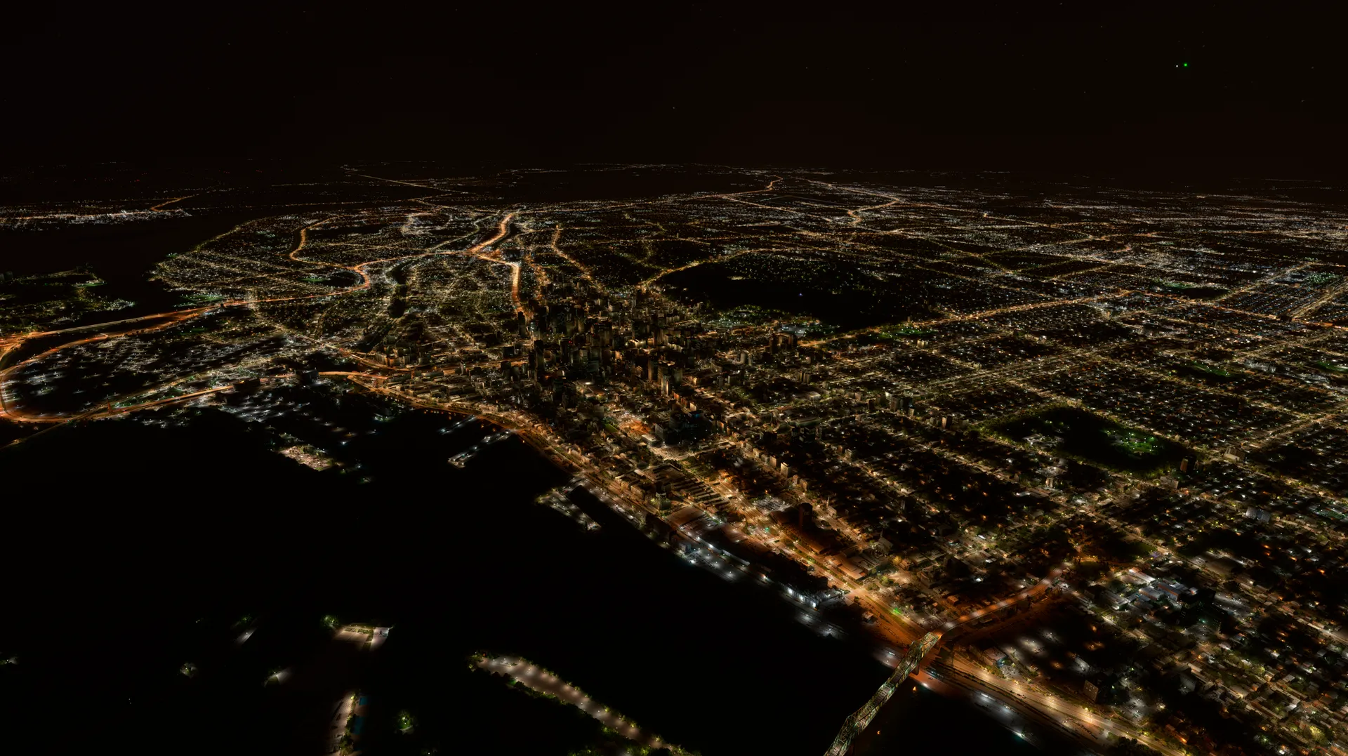 Fly over Montreal and its surrounding areas with a revitalized night-time visual experience.