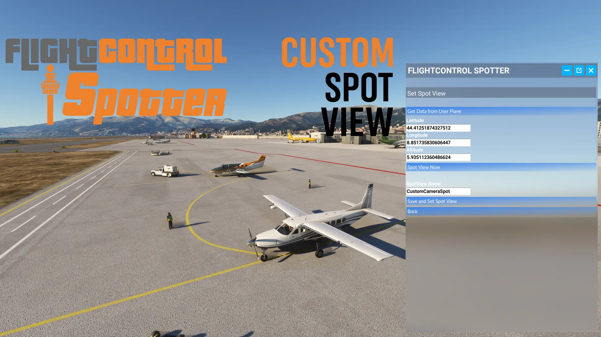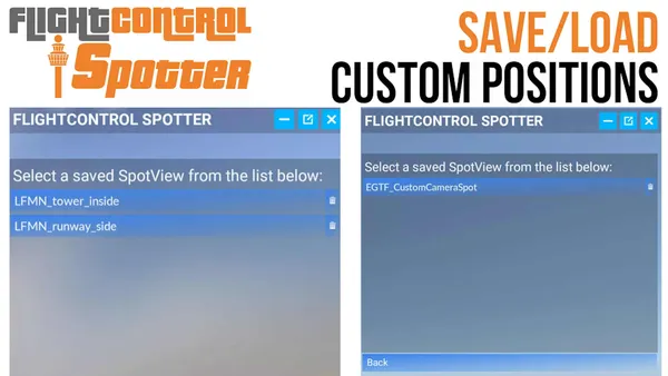 Custom Spot Views – Define your own positions (lat/long/alt), retrieve your aircraft position, or retreive your Avatar (Character's position) [ONLY FOR MSFS2024] or based upon any Preset Spot View in FlightControlSpotter database, and save with custom names.