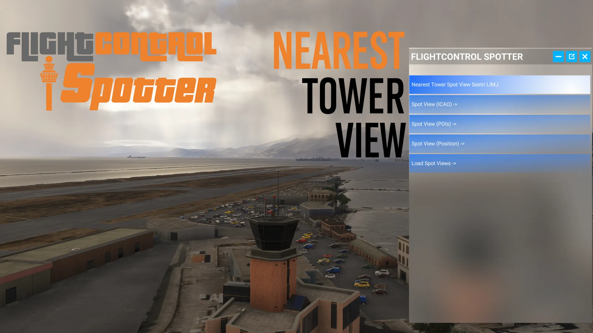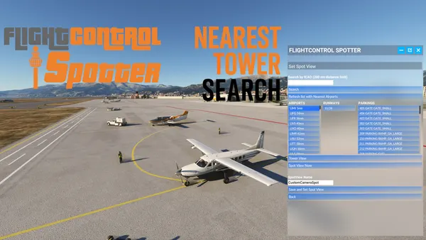 Fully integrated as an in-sim toolbar panel, it gives you one-click access to the nearest control tower, nearby airports, or your own custom-defined spotting locations anywhere in the world.