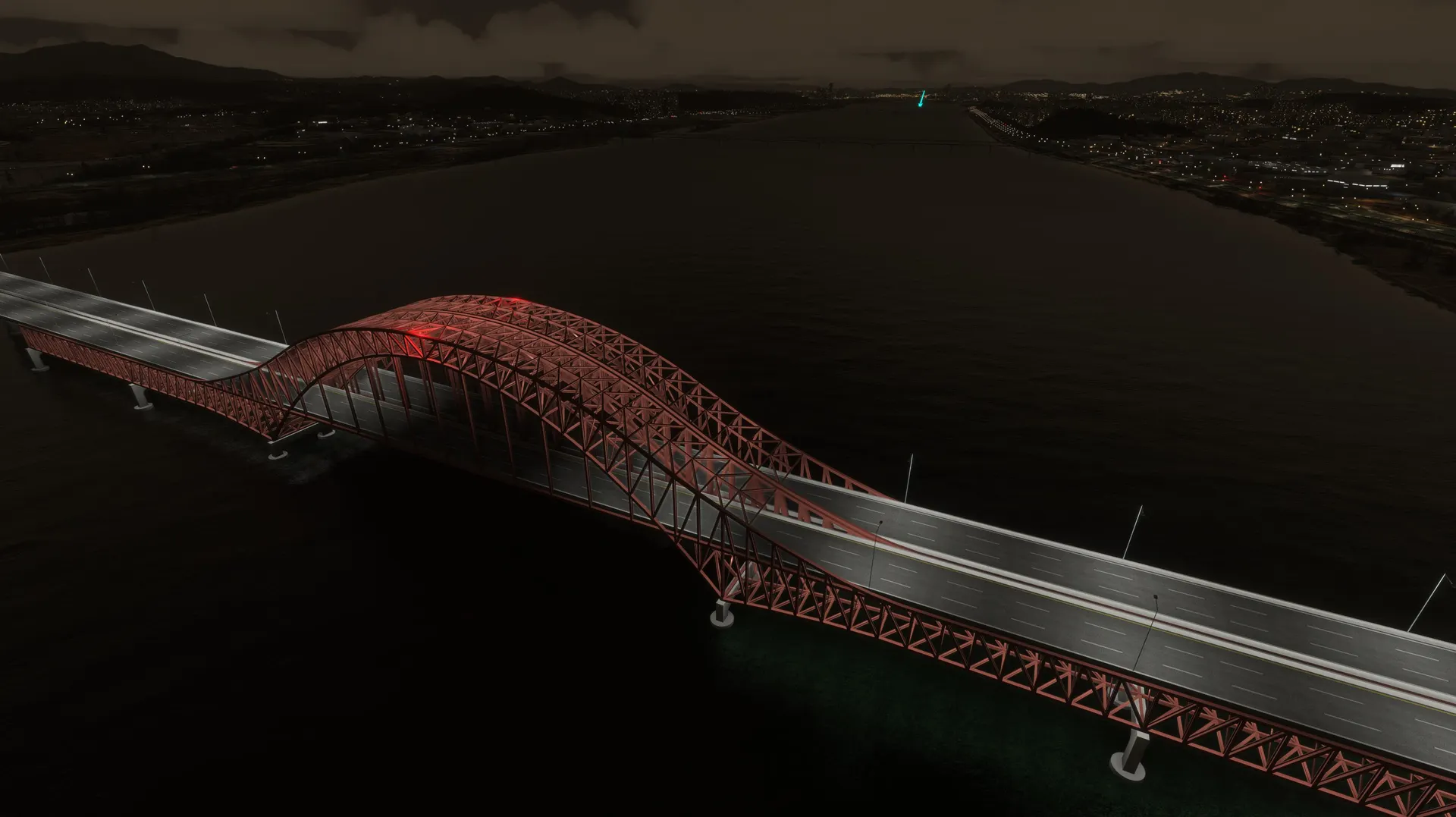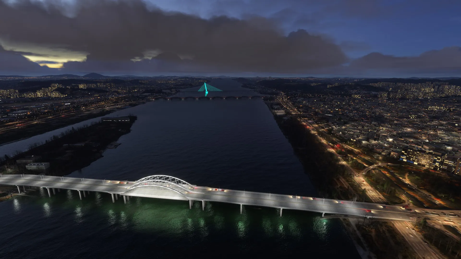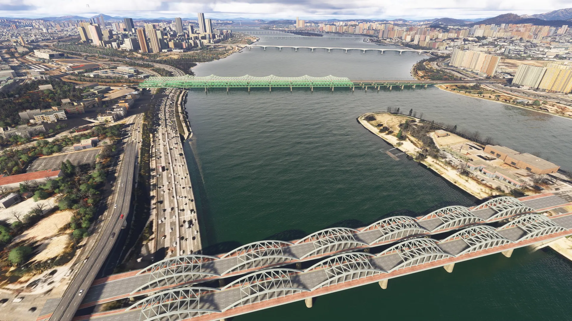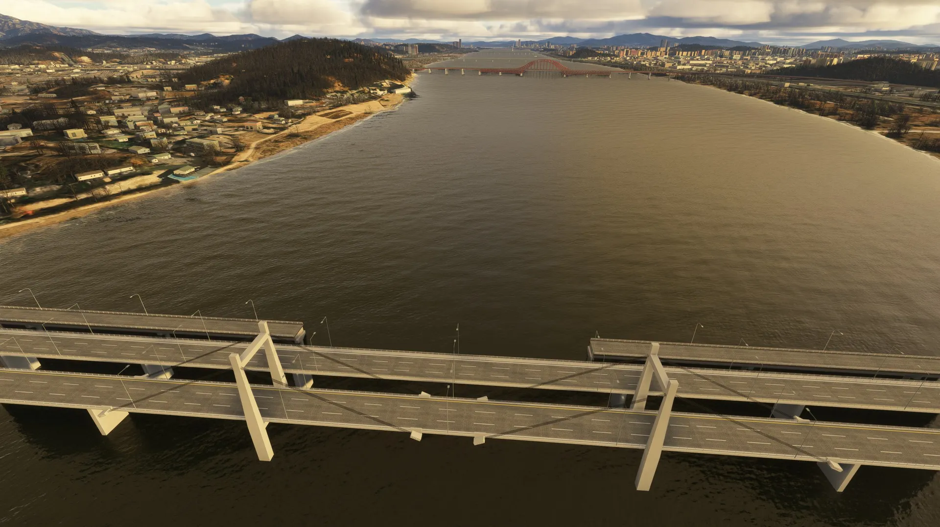 SEOUL BRIDGES This package works with both MSFS2020 and MSFS2024 Seoul, S. Korea, is a very scenic city with mountains, a major river and the ocean all contributing to it’s beauty. Major rivers through cities are very noticeable and the lack of accurate bridges ruins the realism of the flight. This package fixes that for Seoul with modeled bridges representing the correct architecture with appropriate night lighting which, in many cases, is very colorful with traffic flowing on the bridges. Rail bridges which are completely omitted in the sim are also modeled. Some of the bridges are dual purpose for both road and rail with several double deck bridges. The package includes all the bridges on the Han River from the Ilsan Bridge just north west of Gimpo International Airport travelling east through Seoul to the Paldang Dam. Also included are 2 Incheon bridges, the very large cable stayed Incheon Bridge and the Yeongjong Bridge, a large double deck suspension bridge. Photogrammetry should be ON to ensure bridges integrate correctly with sim. IMPORTANT: All bridges have Exclusions applied so if there are conflicts with any other developers addons these can be eliminated by using the Package Reorder Tool in the Sim and putting the rkbridger product below the conflicting product.