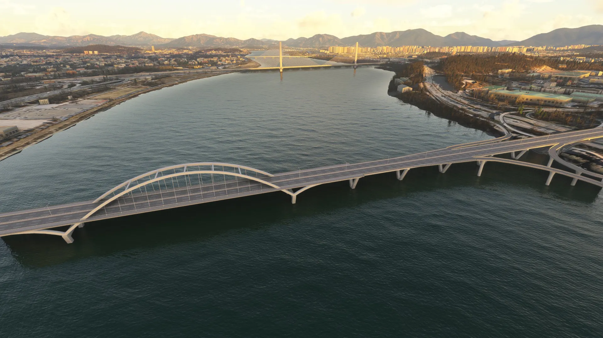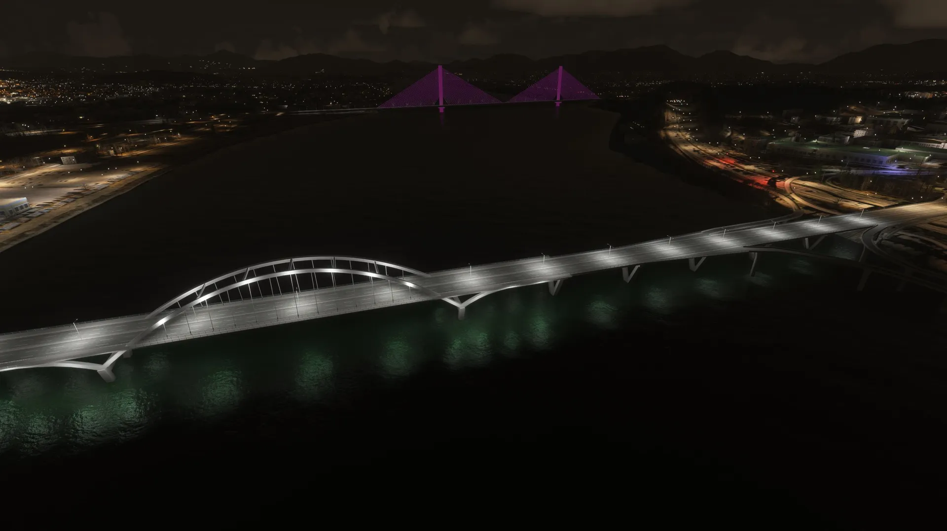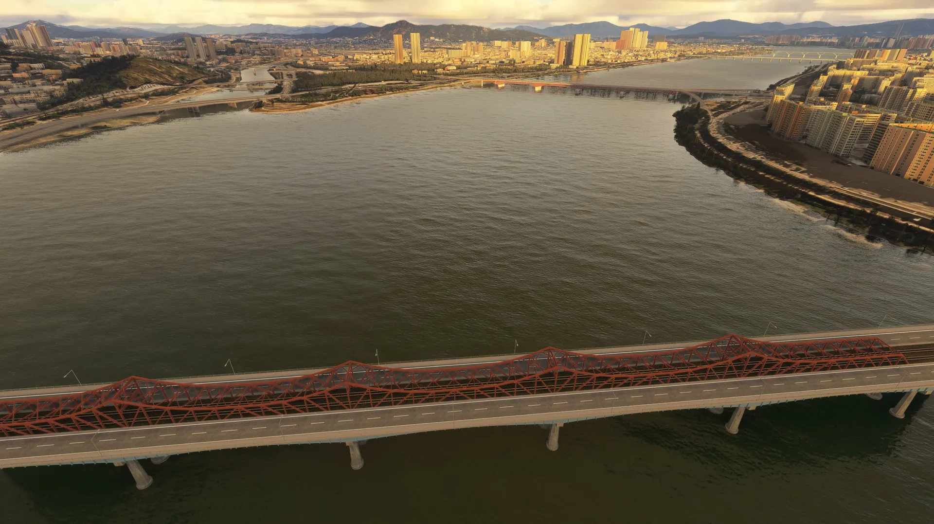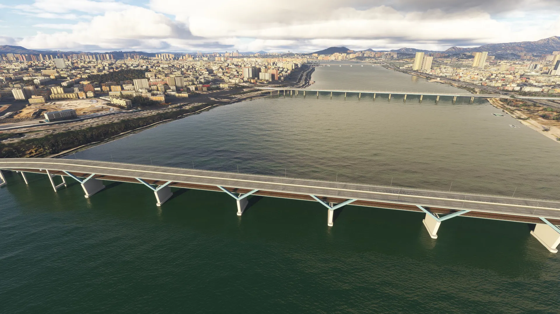 SEOUL BRIDGES This package works with both MSFS2020 and MSFS2024 Seoul, S. Korea, is a very scenic city with mountains, a major river and the ocean all contributing to it’s beauty. Major rivers through cities are very noticeable and the lack of accurate bridges ruins the realism of the flight. This package fixes that for Seoul with modeled bridges representing the correct architecture with appropriate night lighting which, in many cases, is very colorful with traffic flowing on the bridges. Rail bridges which are completely omitted in the sim are also modeled. Some of the bridges are dual purpose for both road and rail with several double deck bridges. The package includes all the bridges on the Han River from the Ilsan Bridge just north west of Gimpo International Airport travelling east through Seoul to the Paldang Dam. Also included are 2 Incheon bridges, the very large cable stayed Incheon Bridge and the Yeongjong Bridge, a large double deck suspension bridge. Photogrammetry should be ON to ensure bridges integrate correctly with sim. IMPORTANT: All bridges have Exclusions applied so if there are conflicts with any other developers addons these can be eliminated by using the Package Reorder Tool in the Sim and putting the rkbridger product below the conflicting product.