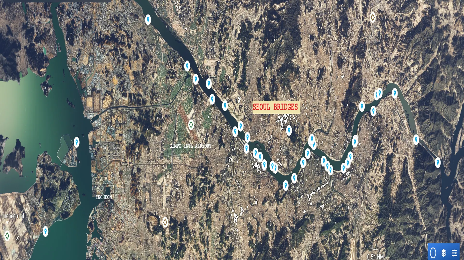 Bridges: Ilsan Bridge Gimpo Bridge Haengju Cable Bridge Haengju Bridge Old Haengju Bridge Banghwa Bridge Magok Rail Bridge Gayang Bridge World Cup Bridge Seongsan Bridge Yanghwa Bridge Dangsan Rail Bridge Seogang Bridge Mapo Bridge Wonhyo Bridge Hangang Rail 3 Bridges Hangang Bridge Hangang North Bridge Dongjak bridge Banpo Bridge Hannam Bridge Dongho Bridge Seongsu Bridge Dumo Bridge Yongbi Bridge Yeongdong Bridge Cheongdam Bridge Cheongdamgyo 2 Bridges Jamsil Bridge Olympic Bridge Cheonho Bridge Gwangjin Bridge Guri Amsa Bridge Godeok Topyeong Bridge Gangdong 2 Bridges Suseoggyo Bridge Misa Bridge Paldang Bridge Paldang Dam Incheon Bridge Yeongjong Bridge