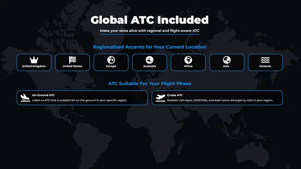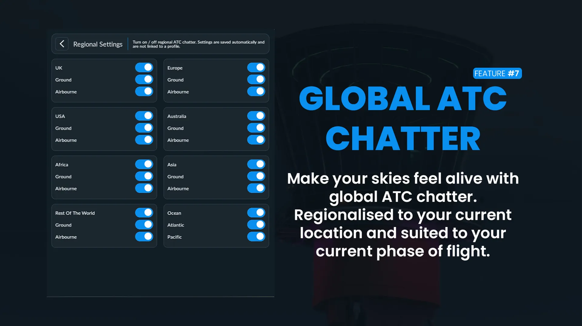Regionalised ATC Chatter Over 70 hours of recorded ATC chatter that adapts based on location and whether you are taxiing or airborne.