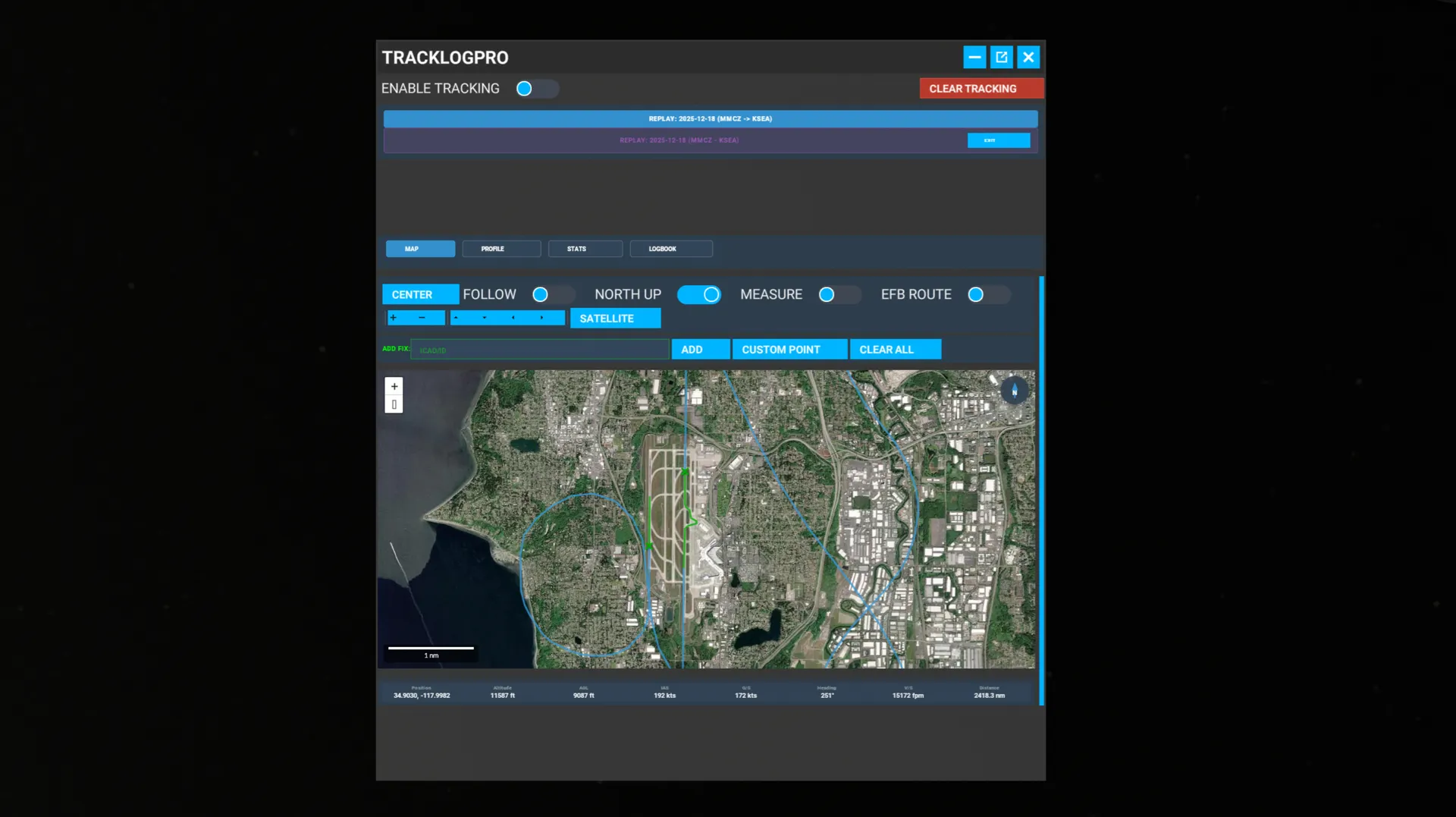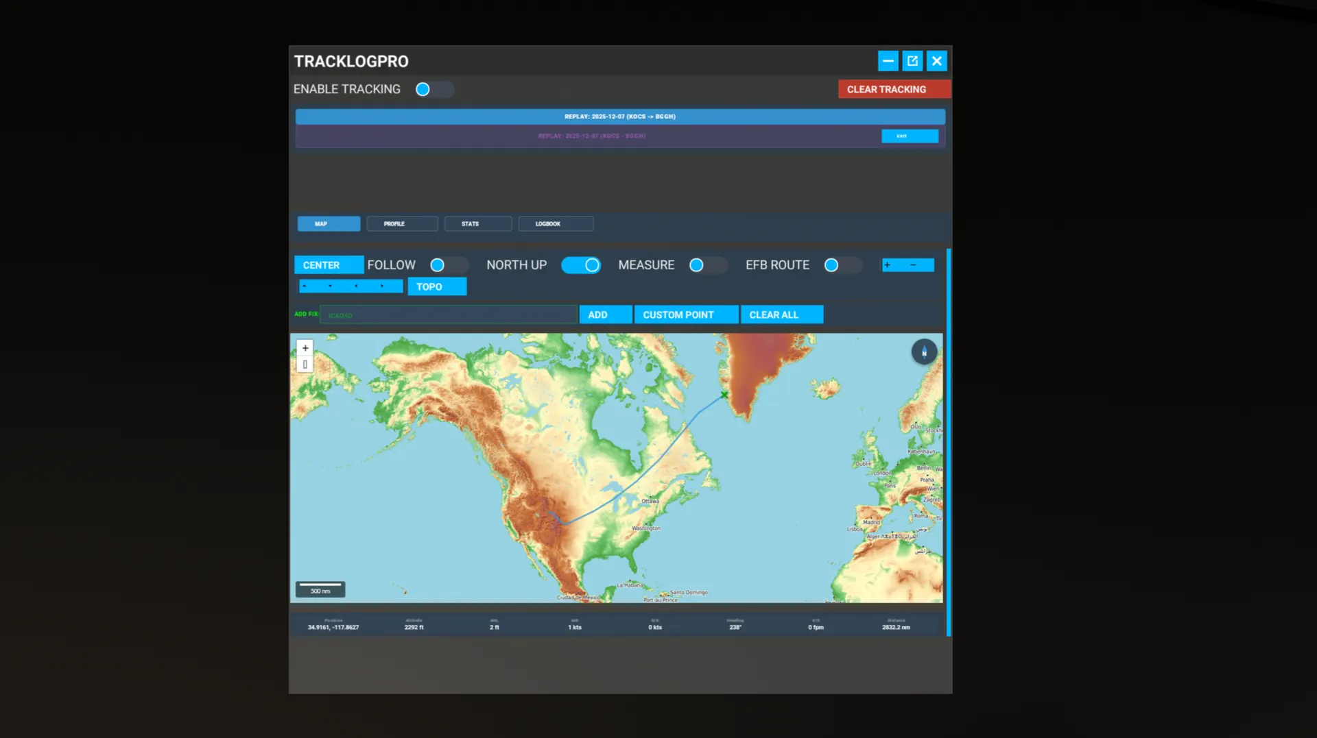 Track Log Pro is a complete, in-sim flight tracking, replay, and logbook solution built specifically for Microsoft Flight Simulator. Designed to work seamlessly on PC, Xbox, and PlayStation platforms, Track Log Pro records your flights in real time, provides powerful analysis tools, and keeps your entire flight history synced to the cloud.